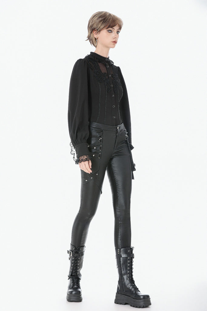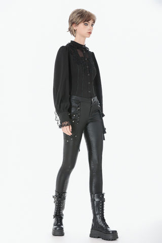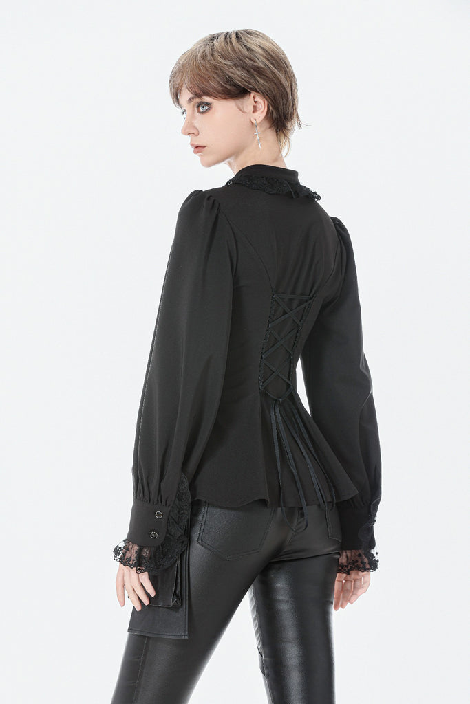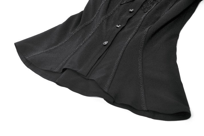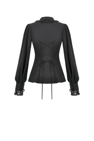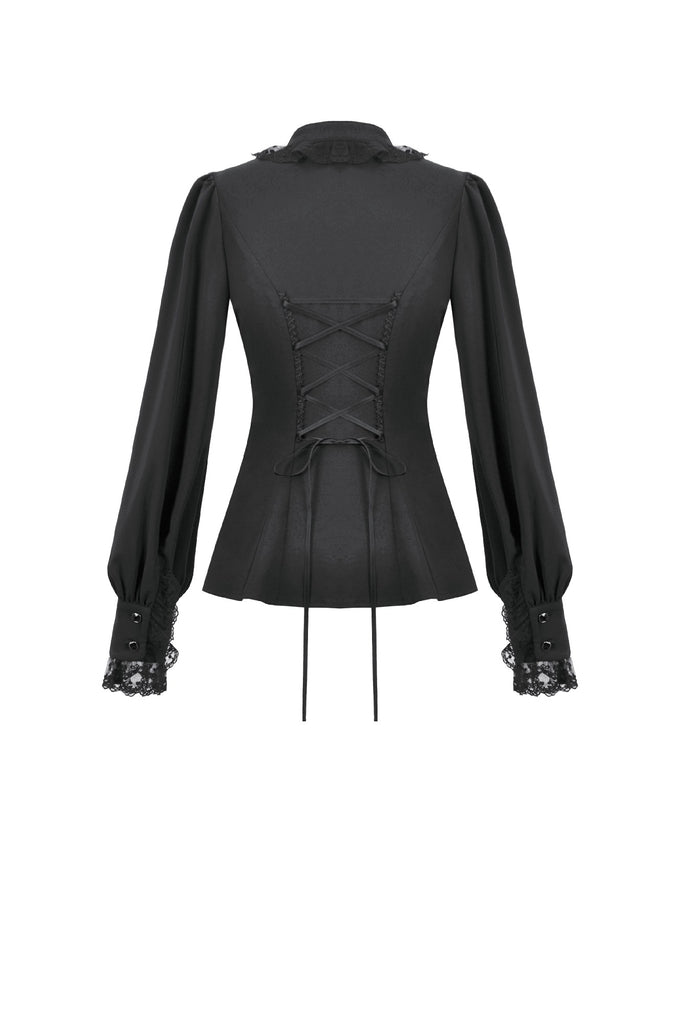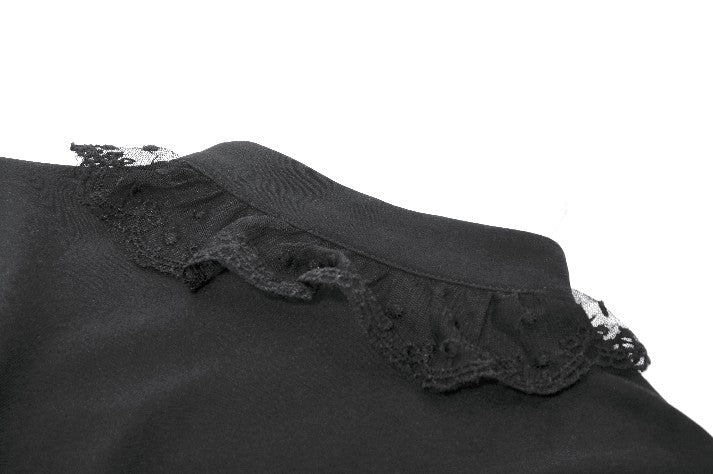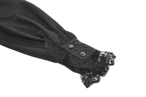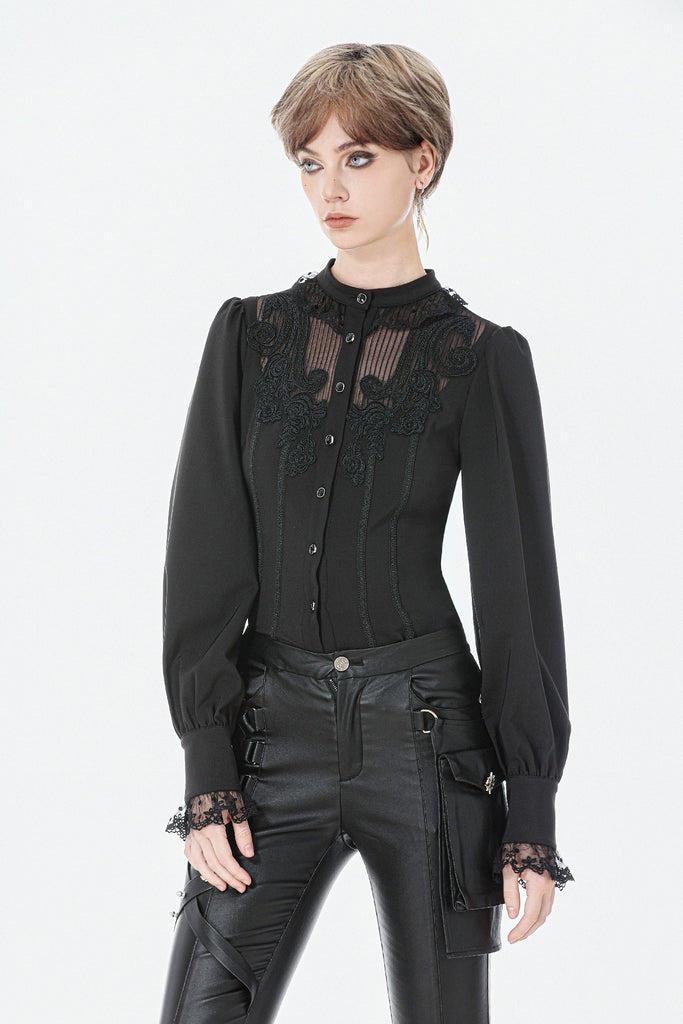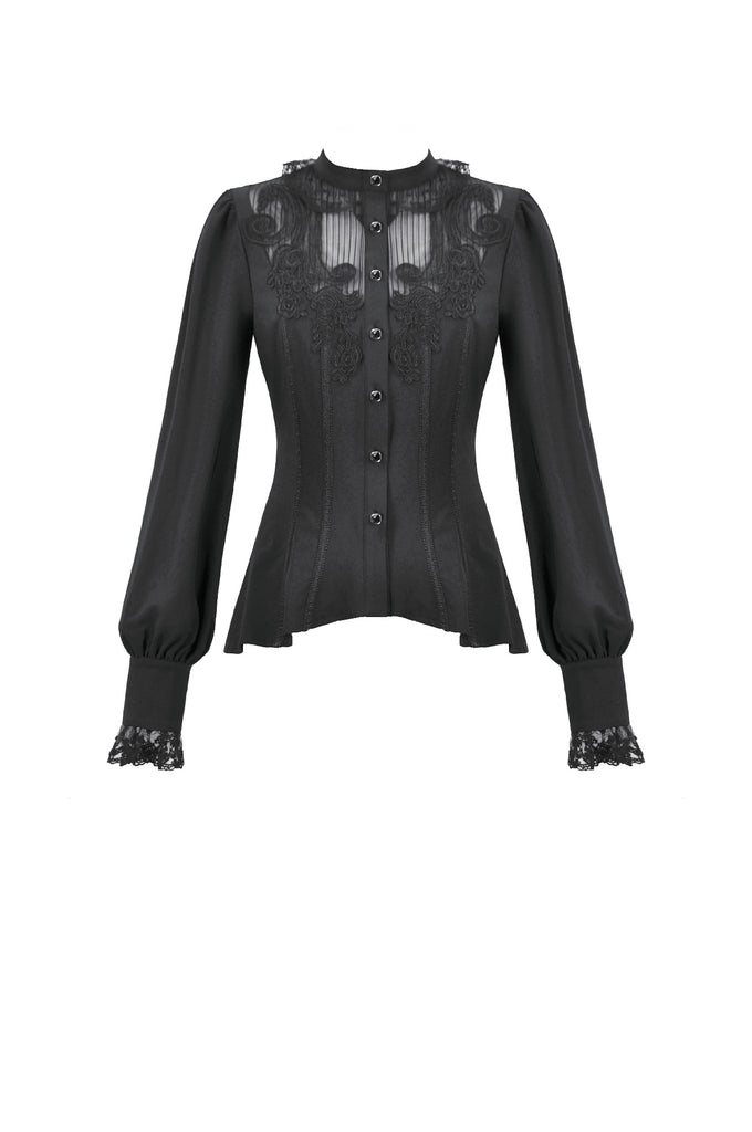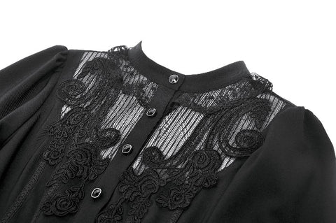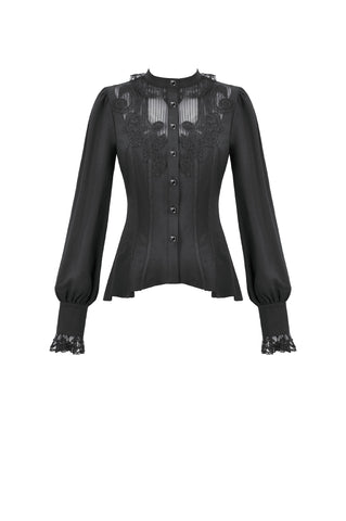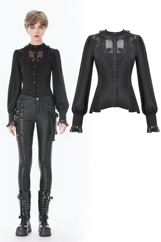 This noble Gothic blouse embodies an elegant and luxurious dark aesthetic. The collar is adorned with delicate lace trim that highlights the neckline with a refined, regal touch. The chest features a combination of striped mesh and black fabric, creating a layered contrast between sheer and solid textures. Intricate, ornate embroidery enhances the focal area, adding richness and dramatic sophistication.