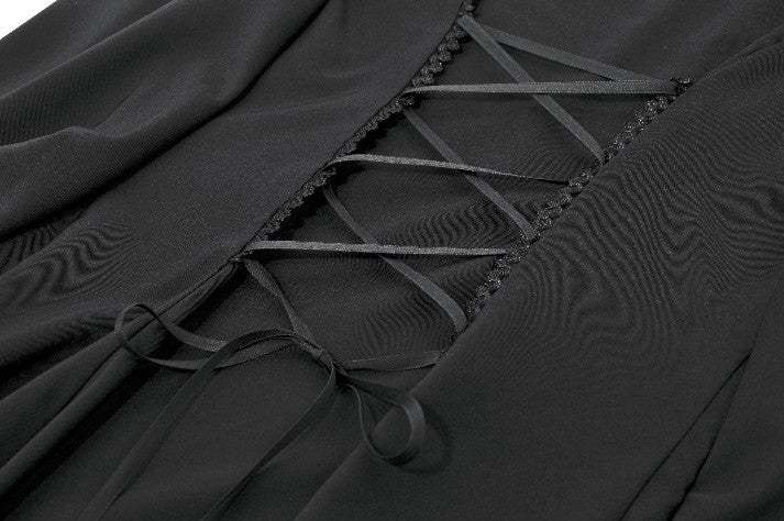 A textured decorative ribbon at the waist shapes the silhouette and elevates the garment’s aristocratic presence. The back is designed with adjustable lacing, allowing the waist to be customized for a better fit and sculpted appearance. The hem features an asymmetrical design with ample flare, creating graceful movement and an expressive Gothic silhouette.