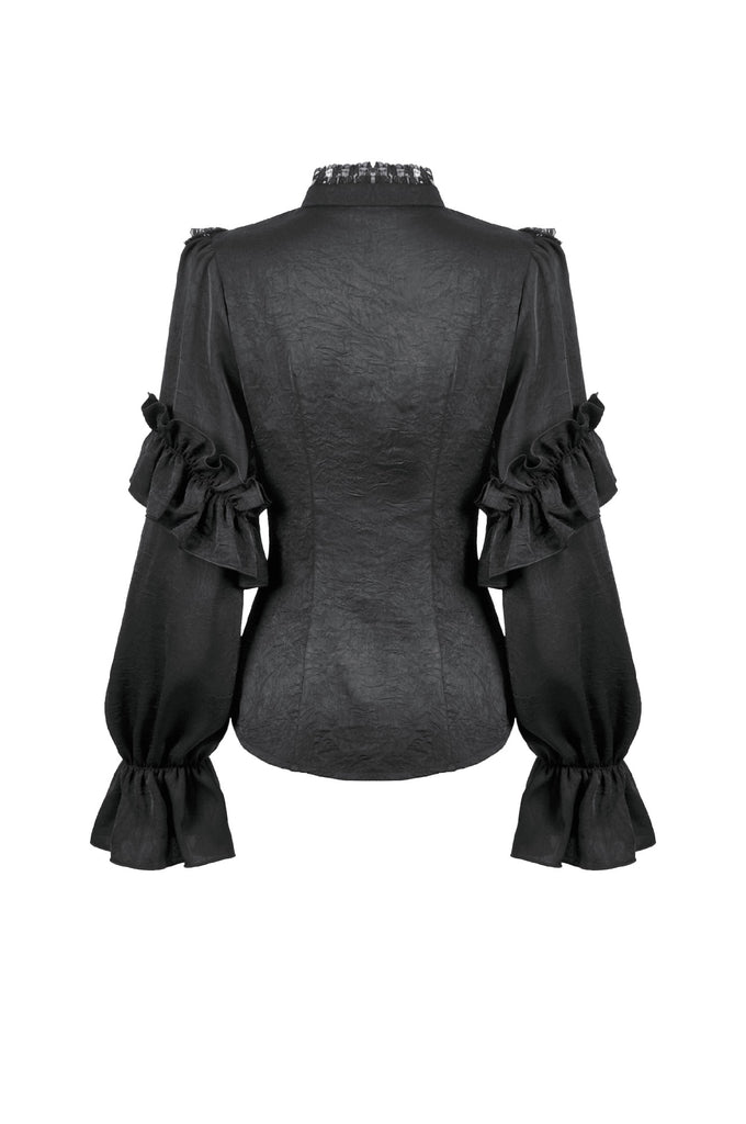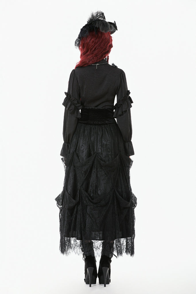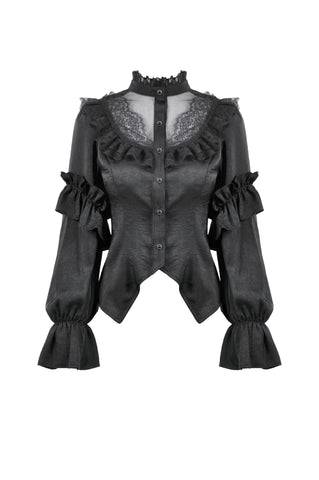 Like a raven gliding through morning mist, this blouse weaves gothic allure with courtly grace. The dramatic U-shaped lace trim frames the chest with a romantic silhouette, layered over translucent mesh embroidered with secrets. Billowing lantern sleeves feature tiered ruffles at mid-arm, adding movement and mystique. With a cinched waist and sculpted hem, it’s perfect for banquets, celebrations—or daily rituals wrapped in shadow.