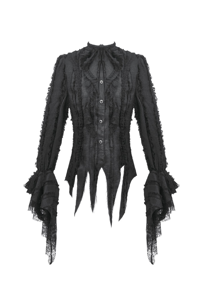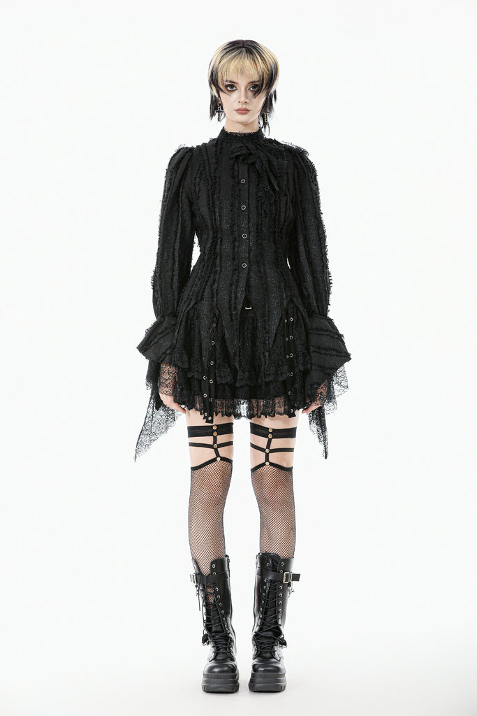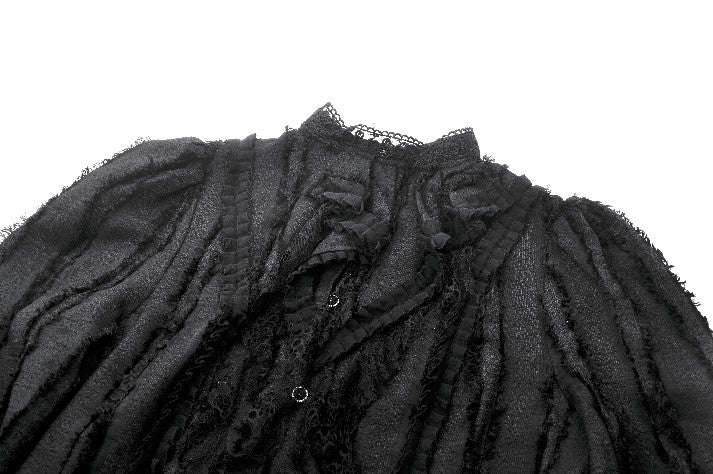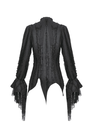 Crafted from ghostly striped burnout fabric, this shirt whispers of forgotten rituals and cursed elegance. The fitted body mimics stitched shadows, while the jagged hem and cuffs evoke a garment torn by time—or by something more sinister. Layered lace cascades from the sleeves in spectral waves, echoing phantom limbs dancing in moonlight. A detachable lace neck ornament adds regal drama or can be removed for a raw, untamed look. Perfect for styling under corsets, or worn alone as a standalone statement, this piece embodies the fragile beauty of decay—equal parts haunted and majestic.