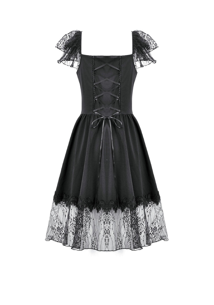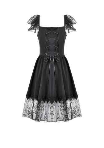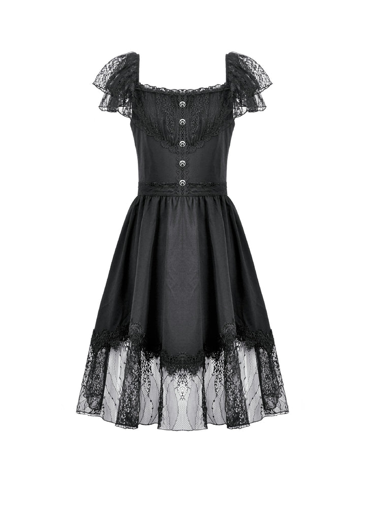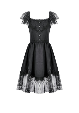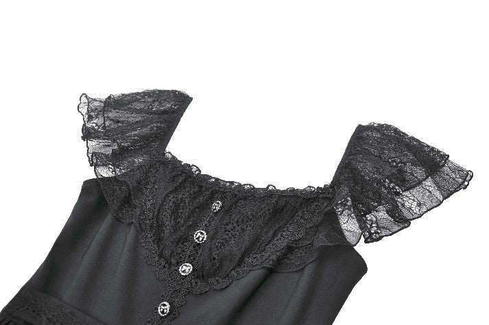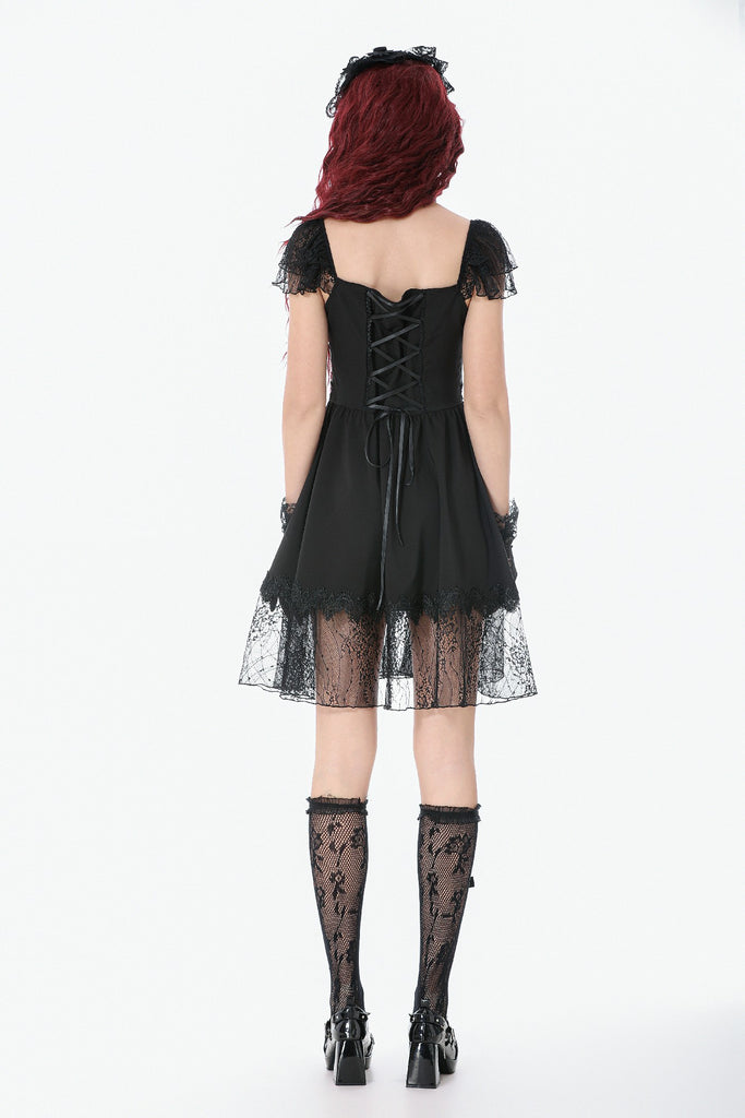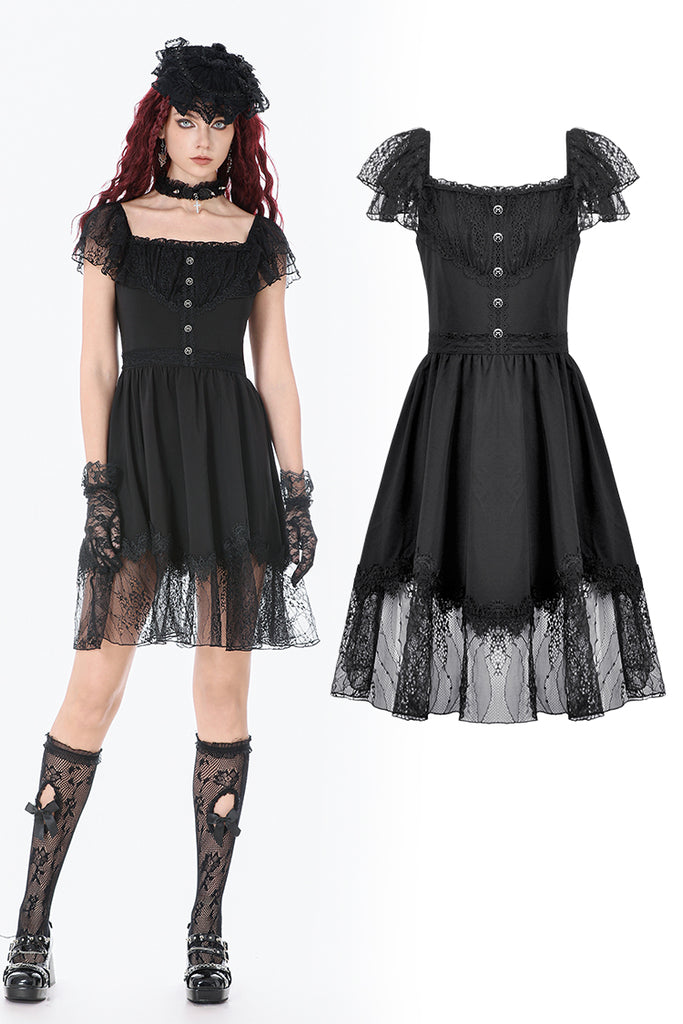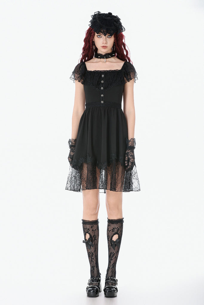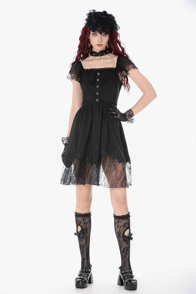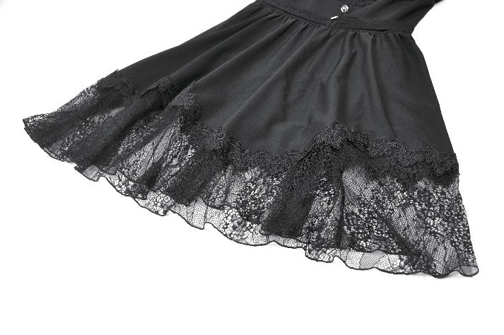 This Lolita lace mini skirt blends a sweet dual-tone black-and-white palette with refined Gothic charm. Delicate bows rest on the ruffled sleeves, adding a soft and girlish touch. The shirred lace bodice and decorative faux placket create rich detail, while the theme is highlighted by the contrasting black-and-white bow buttons.