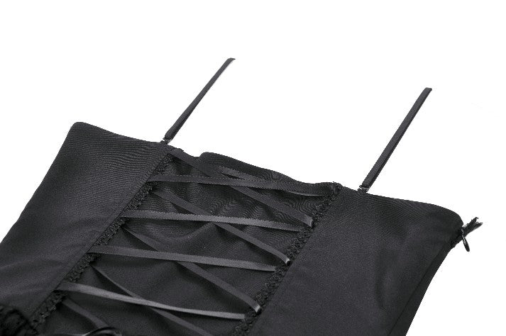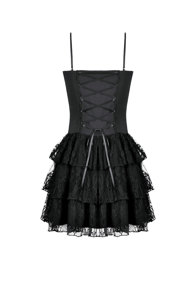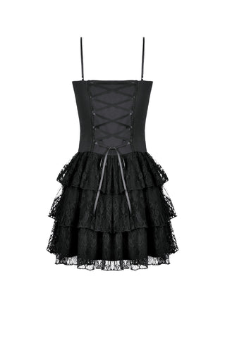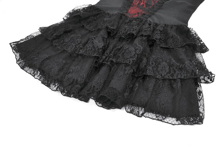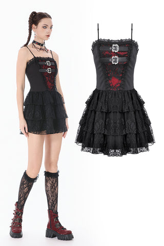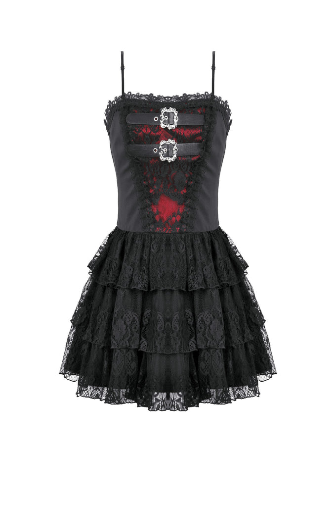 This dress features a matte base fabric layered with multiple tiers of lace, revealing hints of deep red underneath for a striking translucent contrast. Silver-tone ornamental metal buckles accent the bodice with a refined gothic touch. The skirt forms a soft, voluminous lace cake silhouette, while the back lace-up design allows adjustable shaping for a customized fit.