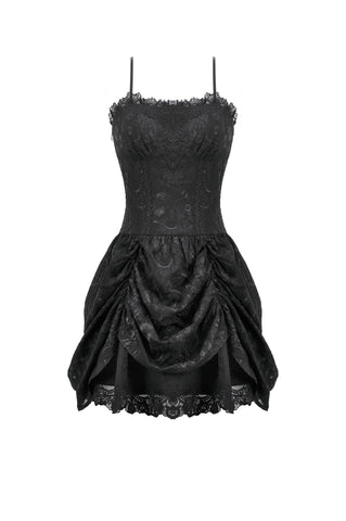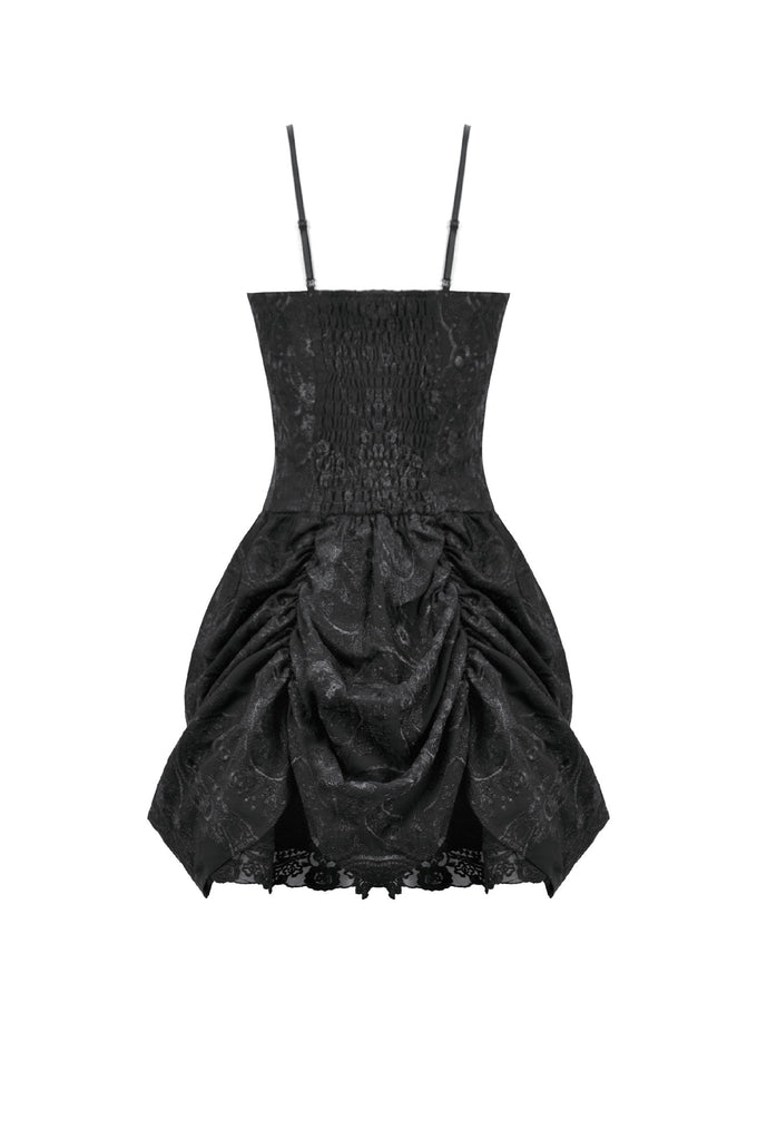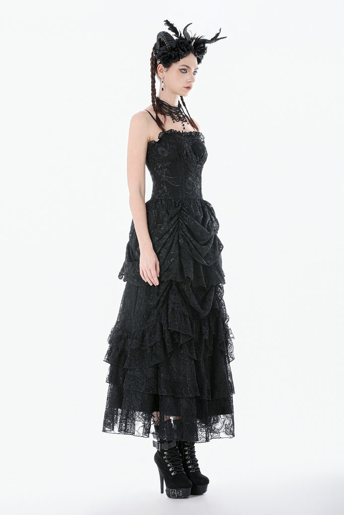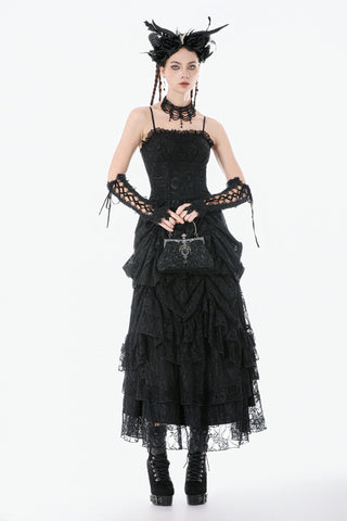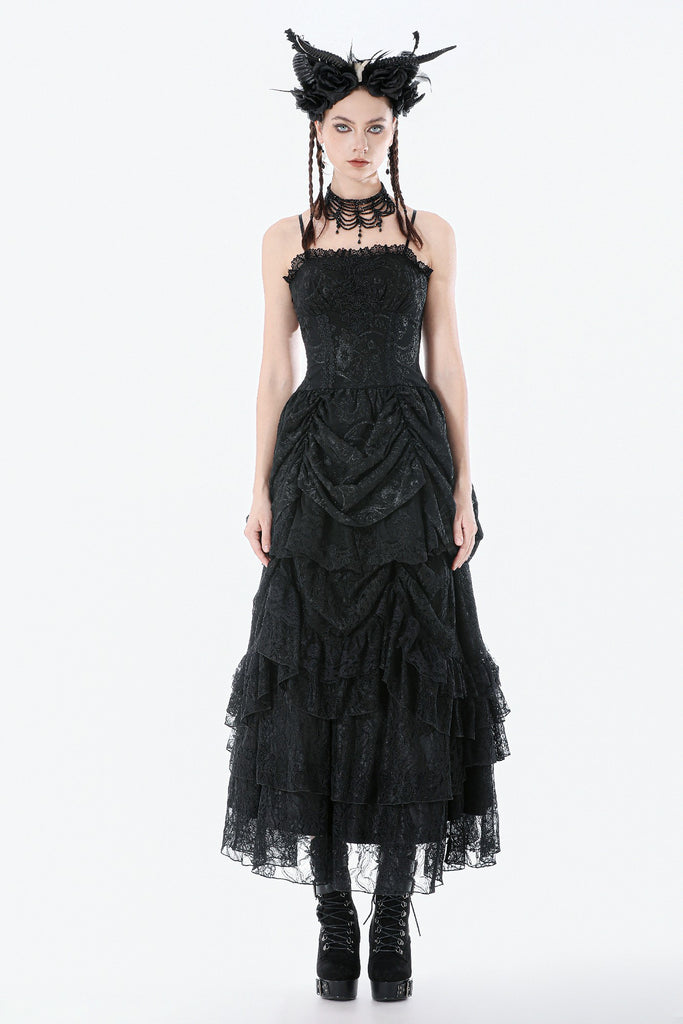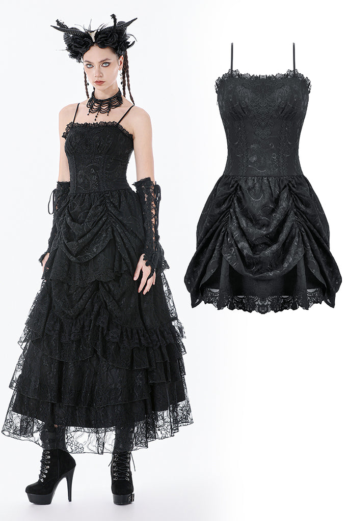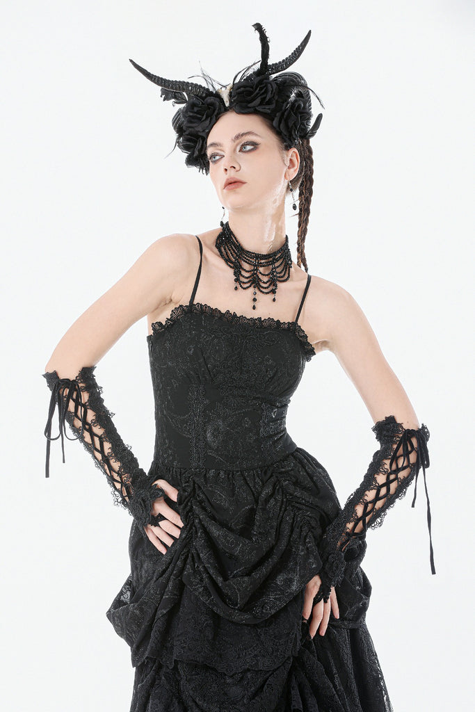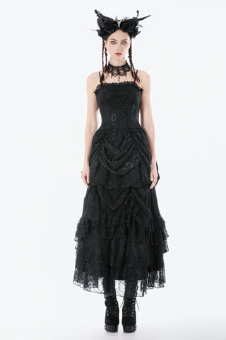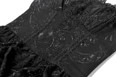 This dark court-style dress is crafted from embroidered sheer fabric with a naturally vintage texture. The corseted bodice defines the waist, while the off-shoulder sleeveless design adds a sensual undertone. The chest features gathered detailing framed with lace for a more ornate finish. Its peplum-inspired skirt uses controlled pleating and soft draping to create a sculpted, voluminous silhouette. The smocked back enhances fit and comfort, making it a striking choice for gothic court aesthetics, special events, or dramatic fashion moments.