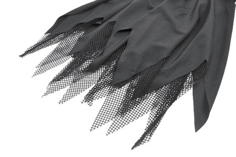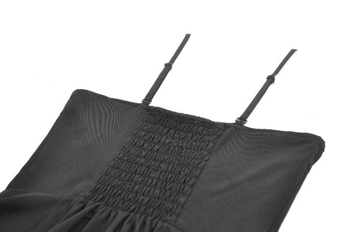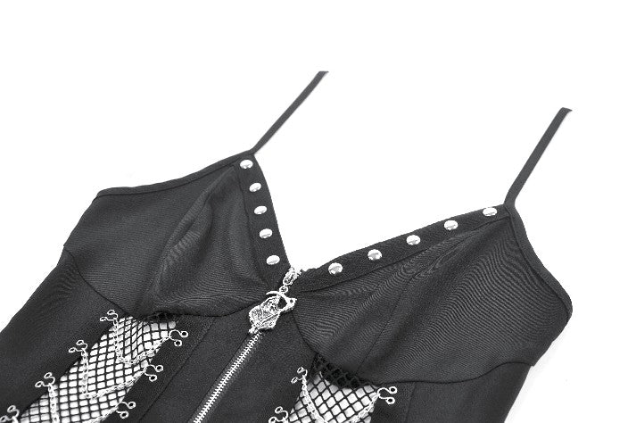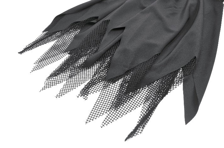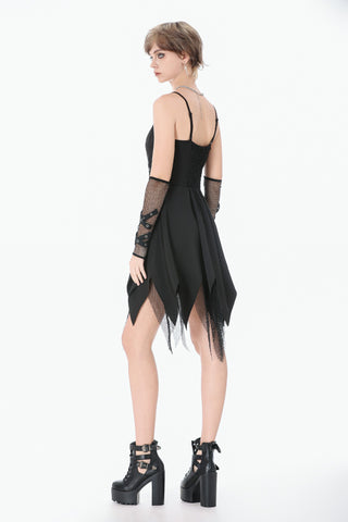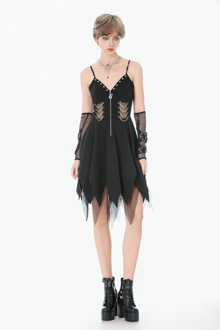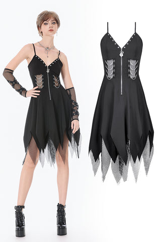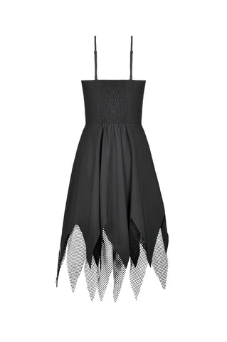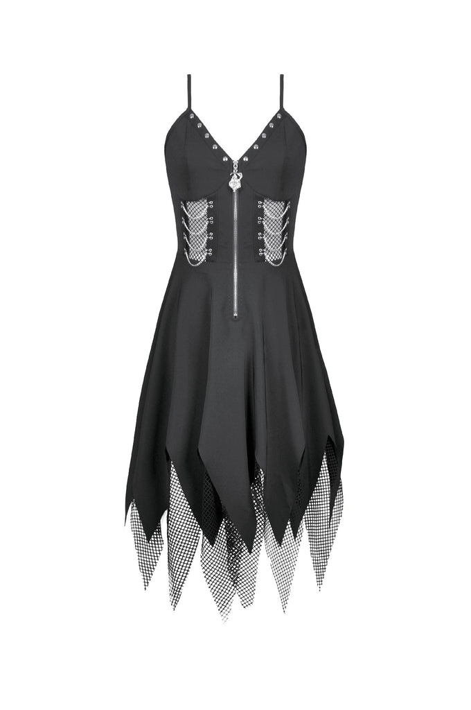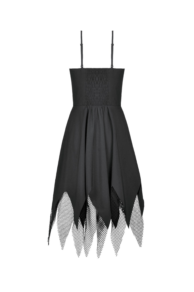 This dress anchors itself in a matte black fabric that drapes with a cool, weighted presence. The hemline merges solid fabric with sheer fishnet, creating a striking interplay of concealment and exposure. Metal accents and dome studs beneath the straps sharpen the punk attitude, forming a subtle sense of restraint around the waist. The jagged, spike-shaped hem moves like broken shadows with every step, delivering a bold, untamed dark aesthetic.