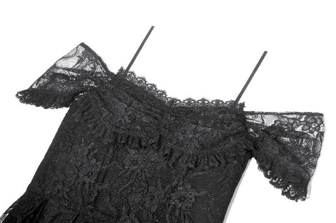 This romantic gothic dress features an off-shoulder lace neckline adorned with delicate lace trims along the top and bottom edges. The skirt is constructed with multiple layers of lace ruffles, creating depth and a softly voluminous silhouette that blends gothic darkness with graceful lightness. The back is designed with adjustable shirring for a comfortable, customizable fit. A versatile piece that brings both elegance and a touch of dark romance to everyday wear or special occasions.