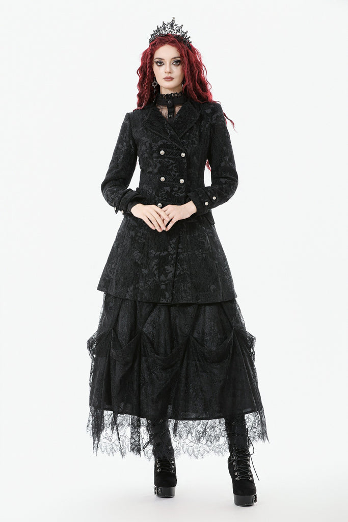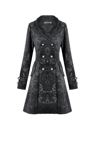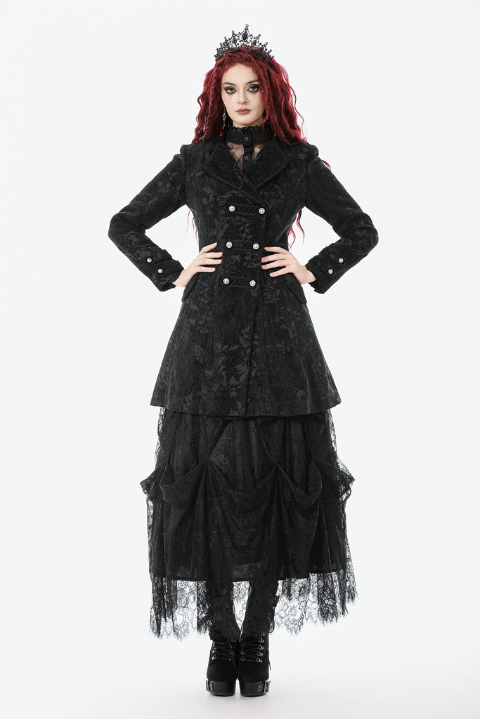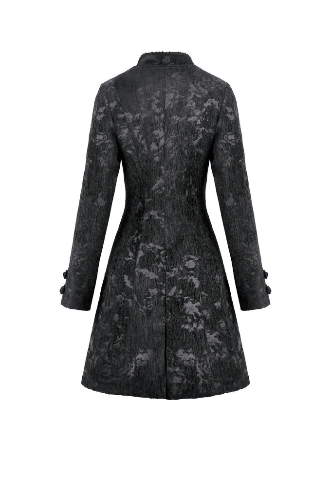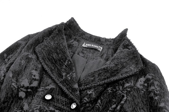 This Gothic velvet coat features a structured silhouette with decorative seams and buttons along the front for a refined look. The cuffs are accented with strap details, enhancing its Gothic elegance. Designed in a straight-cut overcoat style with side slits and a modified suit collar, it combines formality with a unique edge. Made from warm velvet, it is both versatile and practical, perfect for everyday wear or pairing with Gothic-inspired outfits.