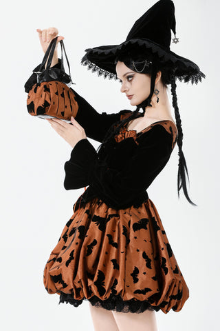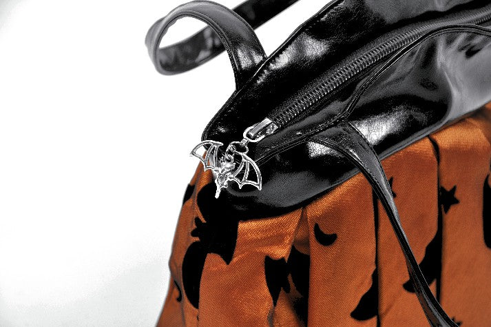Crafted from black leather and orange fabric printed with stars, moons, and bats, this handbag features a sturdy leather handle and base. The central section is pleated into four panels, mimicking the segmented shape of a pumpkin for a playful seasonal touch. The zipper is adorned with a silver bat-shaped pull, echoing the Halloween theme. Stylish yet functional, it’s the perfect accessory for festive outings and parties.