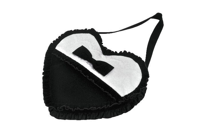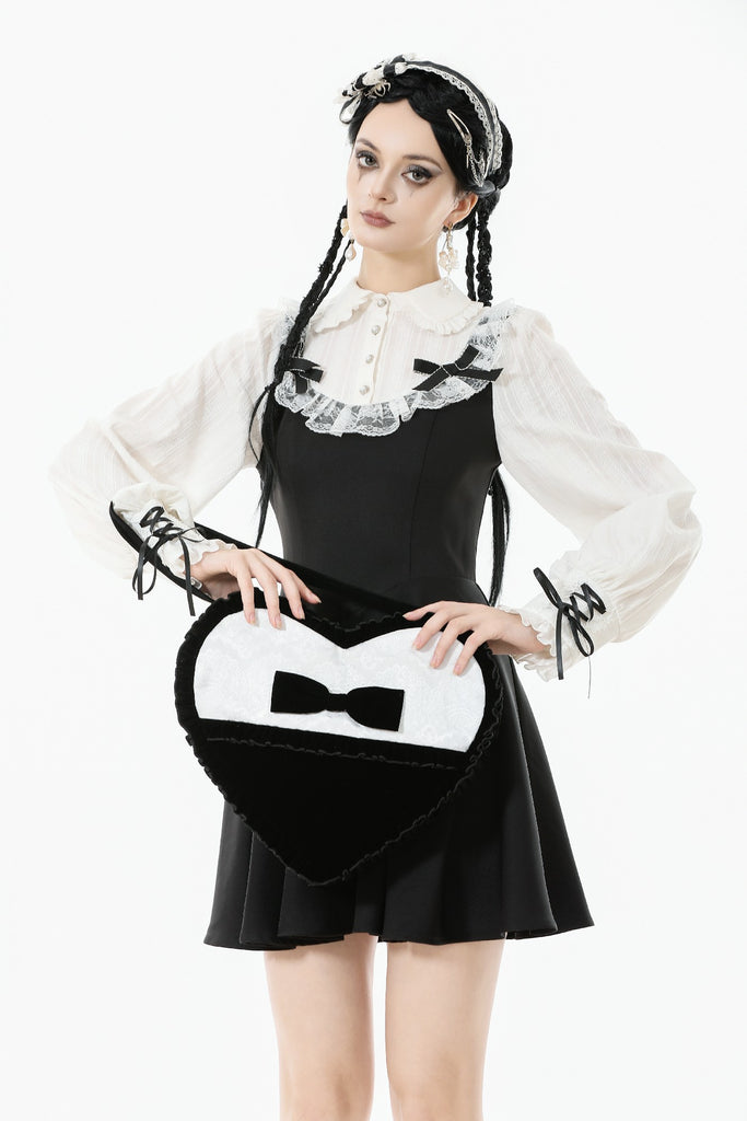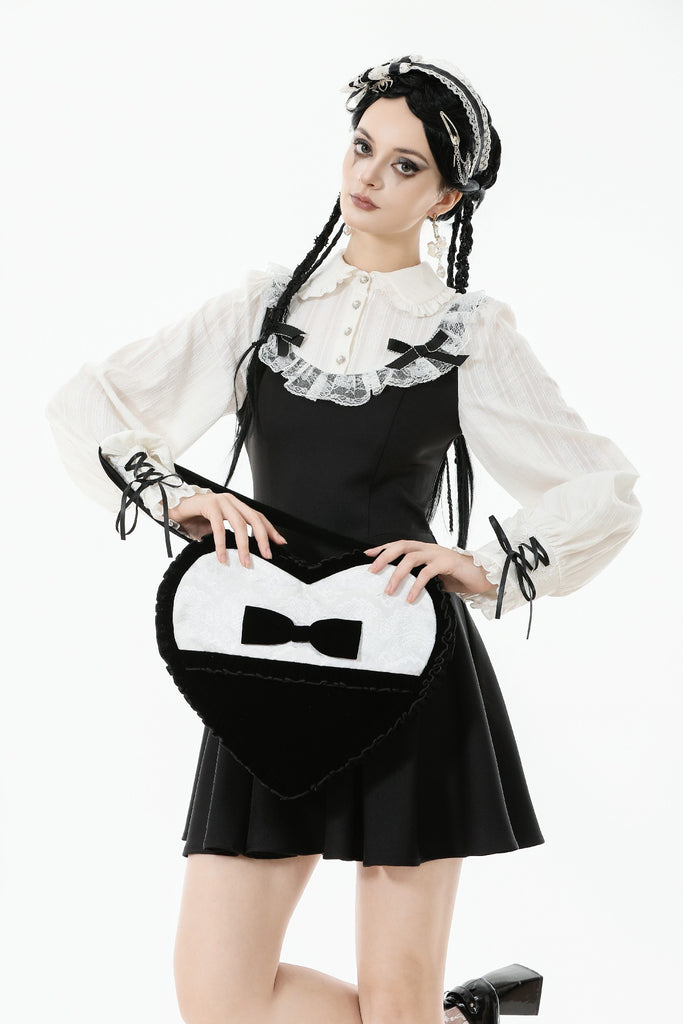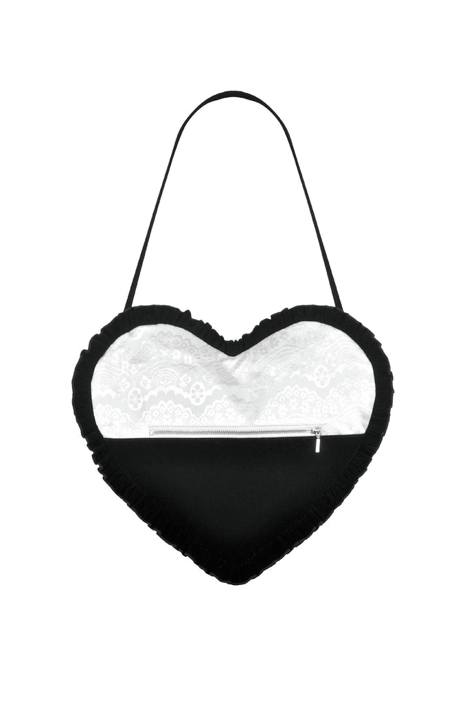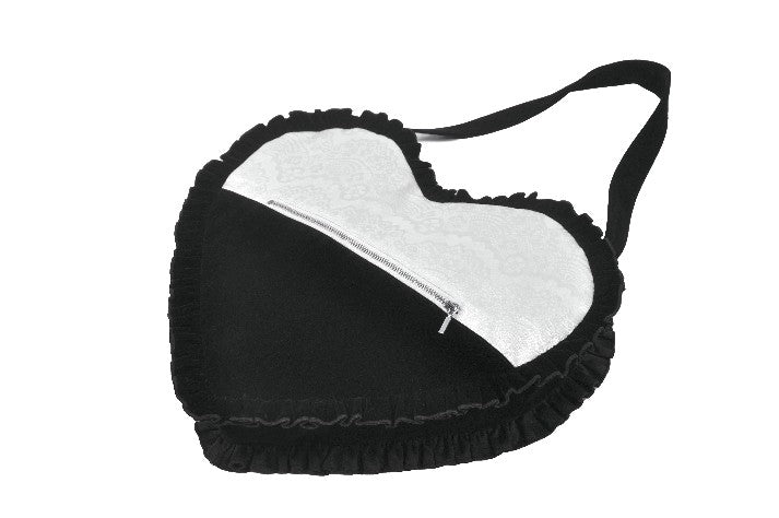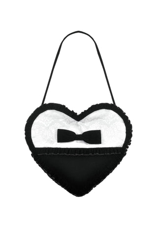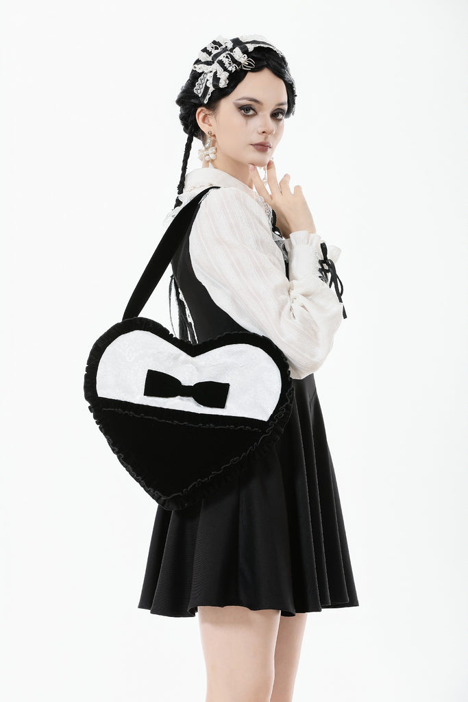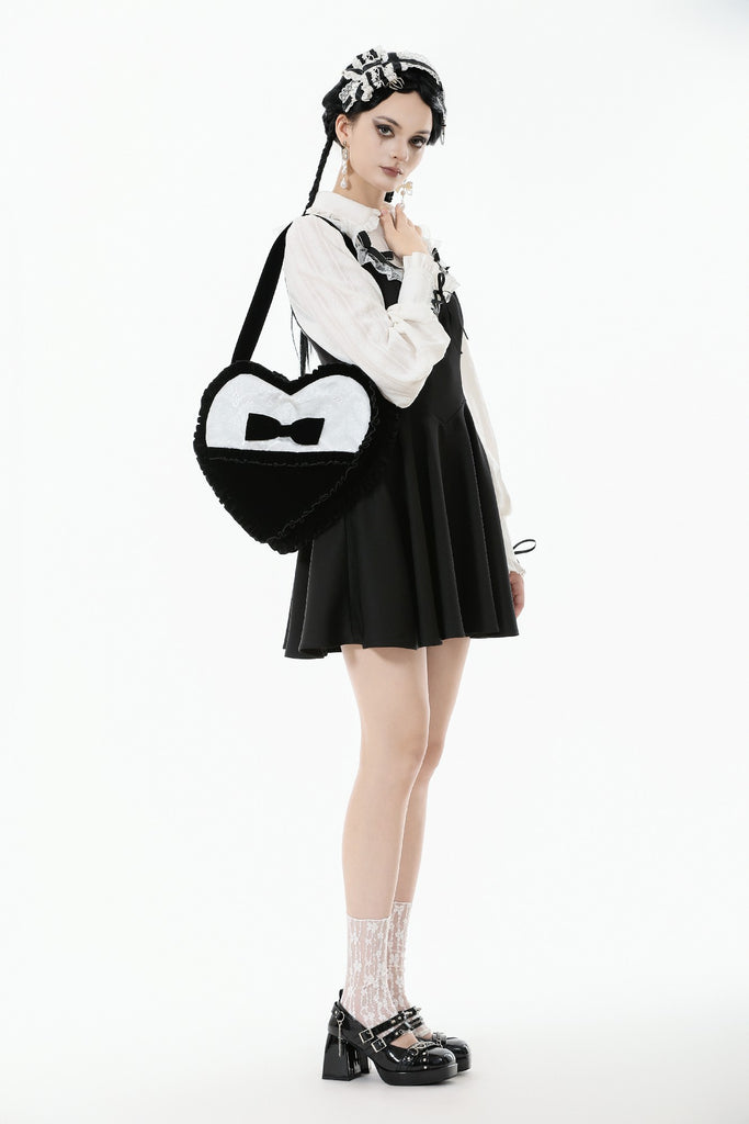 Crafted from plush suede and jacquard fabric, this heart-shaped bag features a 2.5cm ruffled suede trim. The design is split evenly: white jacquard fabric on the upper half and black suede on the lower half. A plush bow decorates the jacquard section, while ruffled suede trim at the dividing line creates a smooth visual transition. The main compartment is secured with a zipper featuring a silver heart pull, and the back includes a horizontal zipper pocket perfect for a phone. Ideal for daily wear or outings, especially when paired with monochrome outfits.