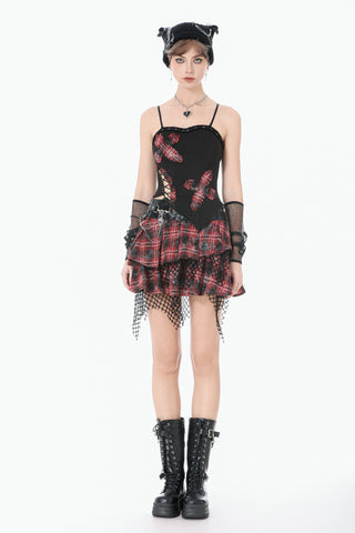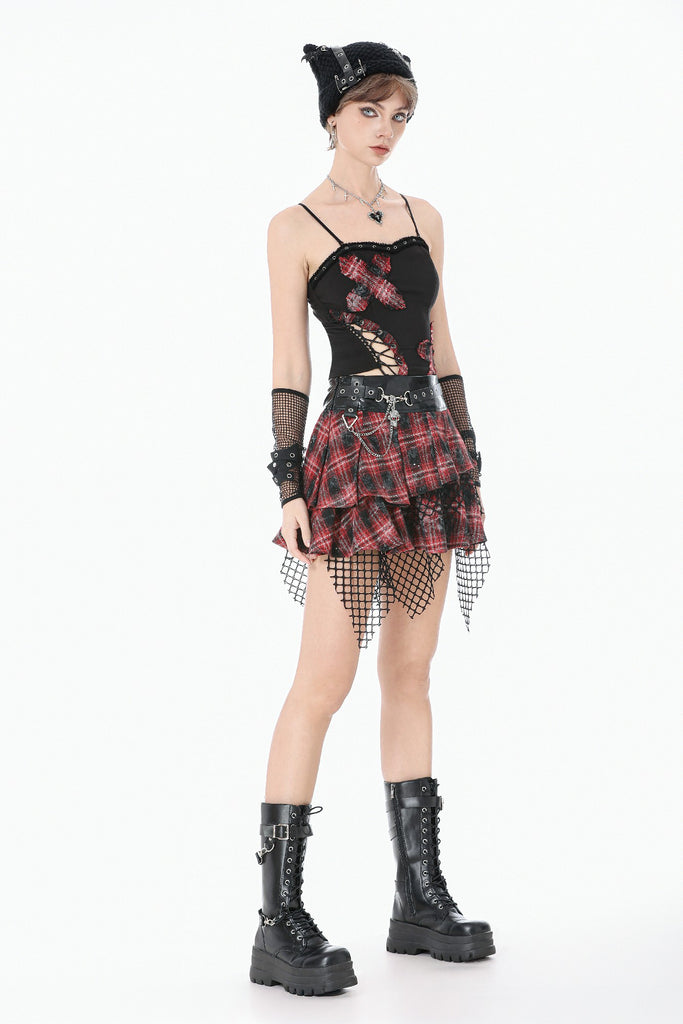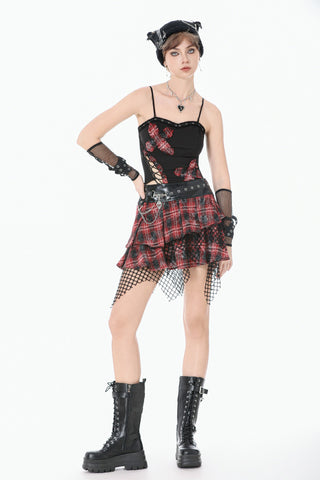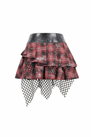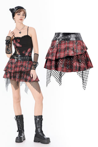 This punk mini skirt blends distressed tartan, glossy faux-leather, and torn mesh to create a fiercely chaotic visual impact. The red plaid fabric carries smoky, worn-out textures with scattered sparkles, giving it a lived-in, rebellious aesthetic. Beneath it, the irregular black mesh drapes like shredded stage curtains, adding raw movement and attitude.