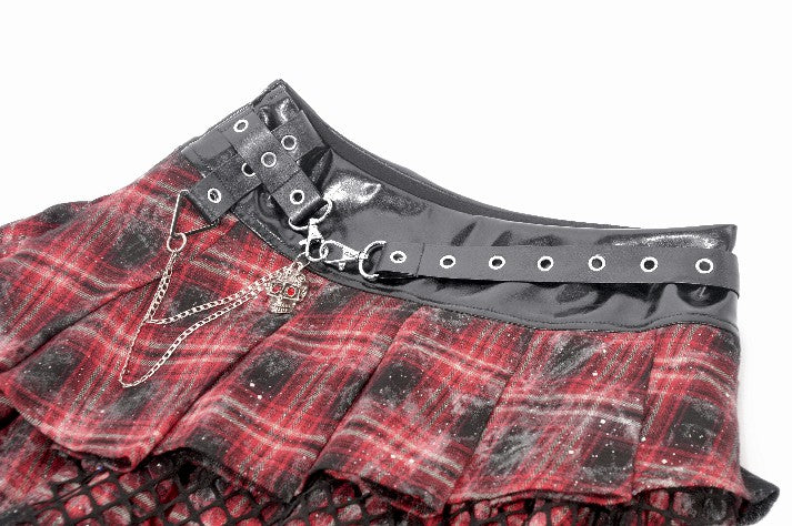 The wide faux-leather waistband is reinforced with metal eyelets, studs, and a lobster clasp, forming a rigid industrial frame. Dangling chains and a skull charm add a sharp metallic contrast against the vintage plaid, amplifying the piece’s dark punk signature.