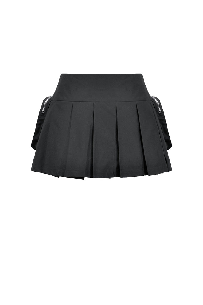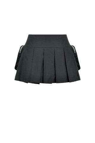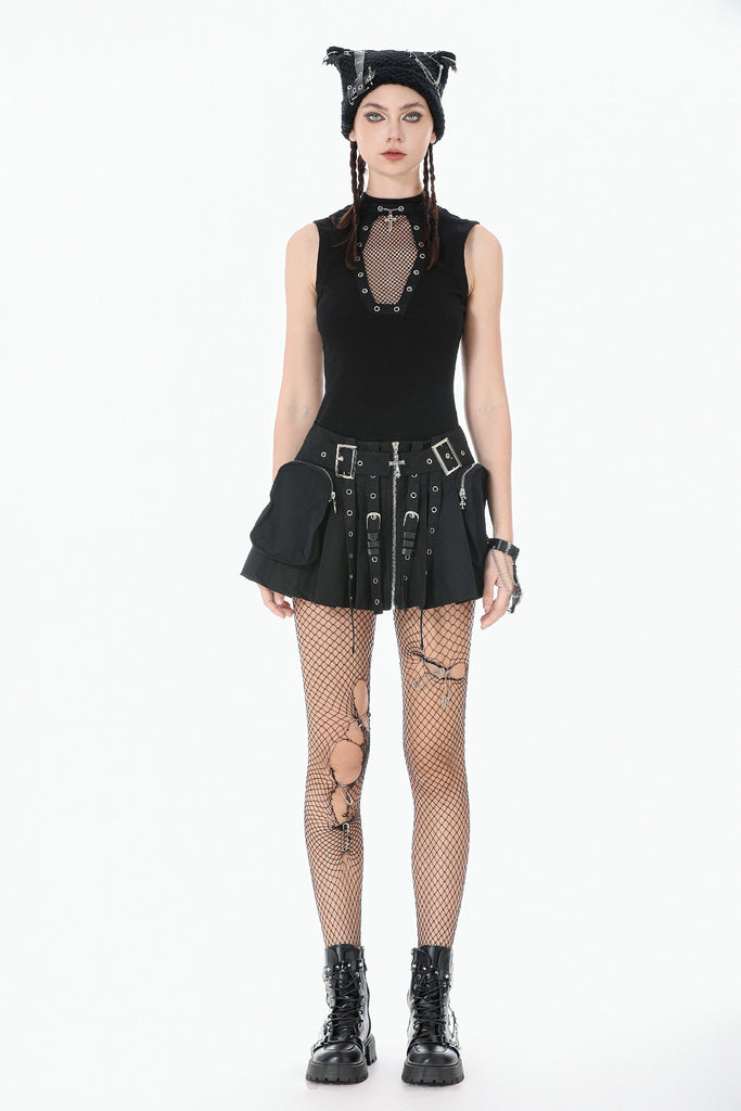 The inner pleated skirt adds volume and movement, balancing toughness with a subtle girlish edge. Tactical pockets on both sides bring utility-inspired attitude, enhanced by metal zippers and cross pendants. Plaid leather buckles, hardware straps, and square-ring details amplify the multidimensional, futuristic punk look.