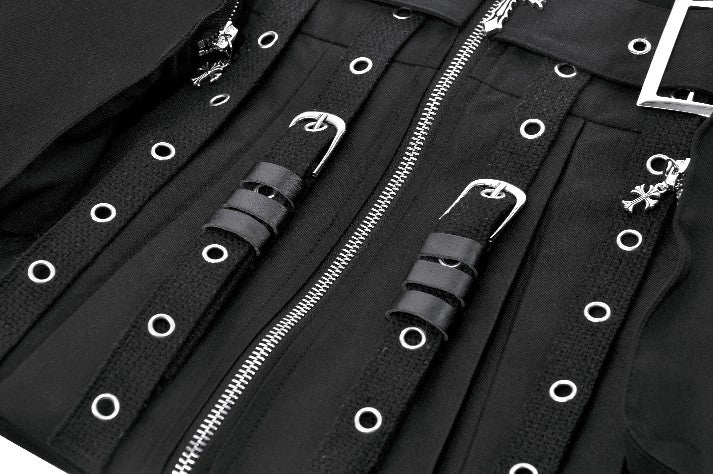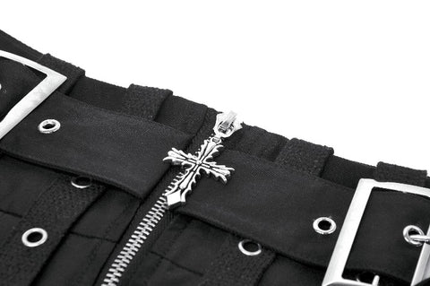 This metal-cross tactical punk skirt fuses Y2K subculture energy with industrial heavy-metal aesthetics, delivering an instant visual strike. Wide straps, metal eyelets, and double dangling bands create a mechanical outer structure, while the central cross charm serves as the bold symbol of rebellion.