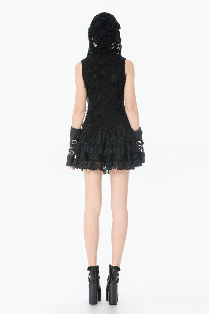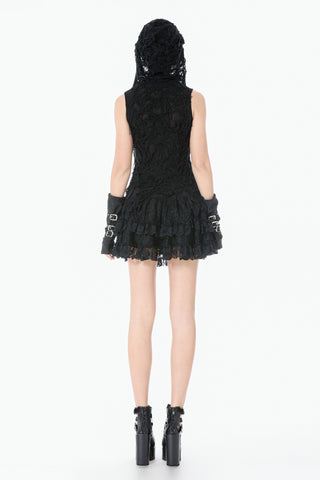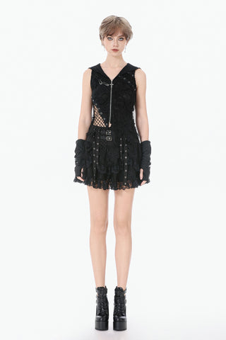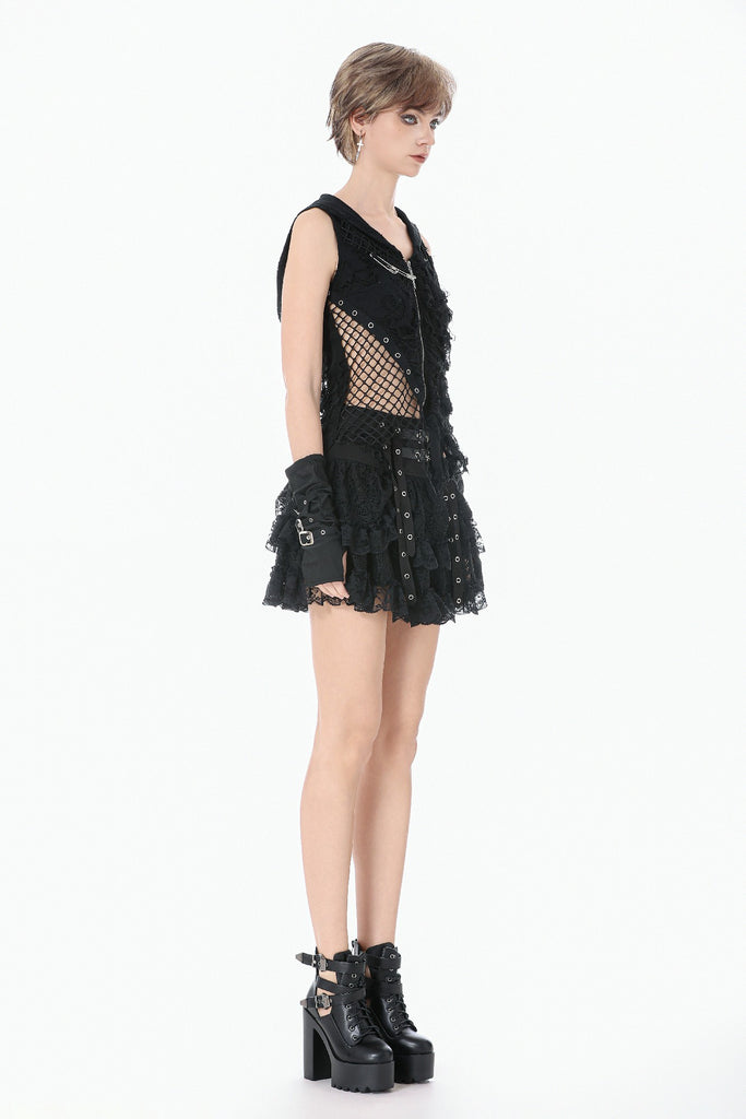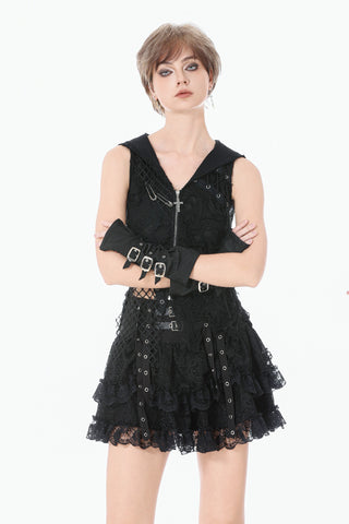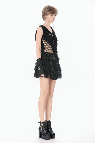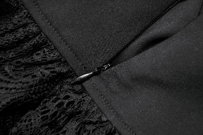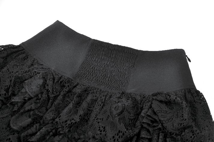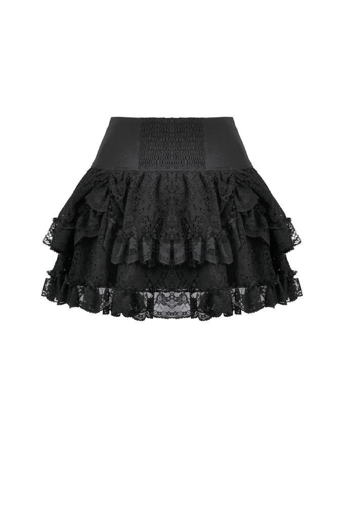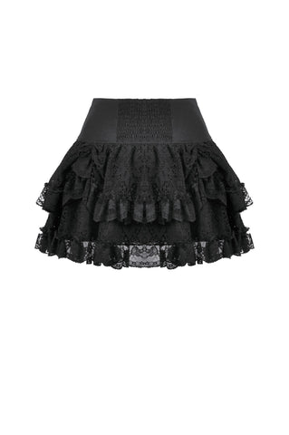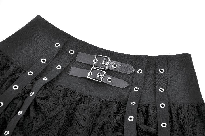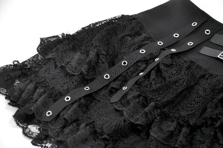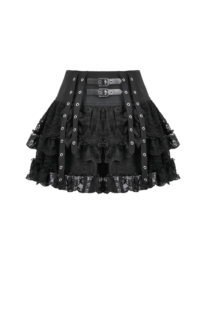 This skirt is defined by a punk-inspired layered design with a structured cake silhouette. Two grommet belts with square buckles decorate the center, emphasizing an industrial and restrained aesthetic, while grommet straps on both sides add visual tension. The first layer of the hem is shaped with gathered details on each side, creating a sculpted and dimensional form. Lace fabric is spliced with solid black material, combining toughness with delicacy, and lace trims along the hem enhance detail and contrast throughout the design.