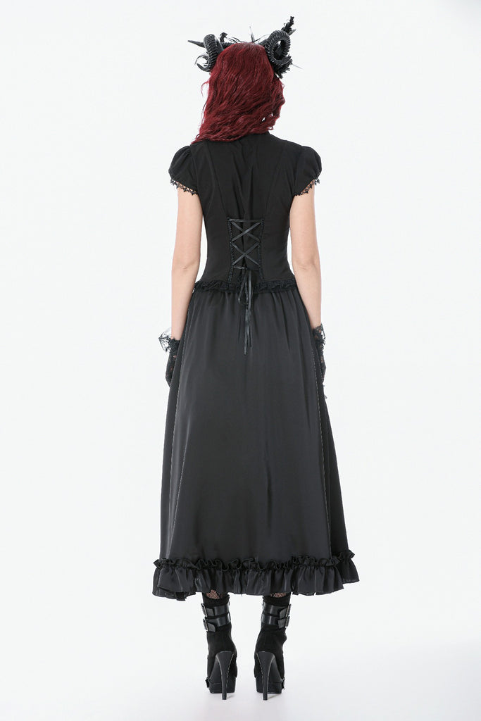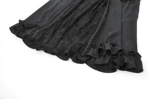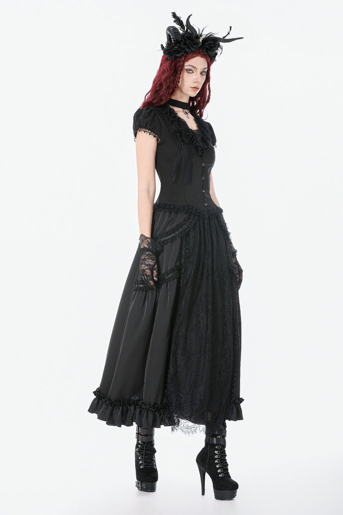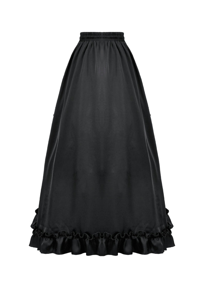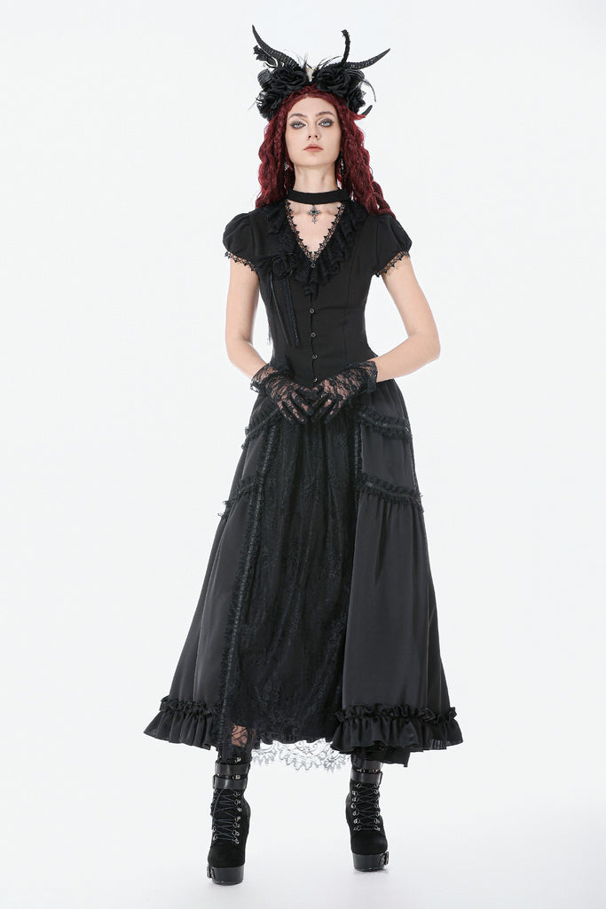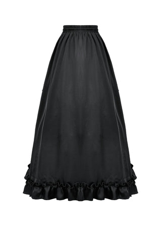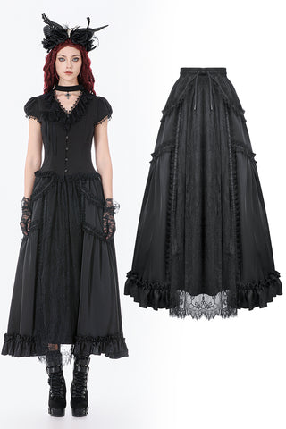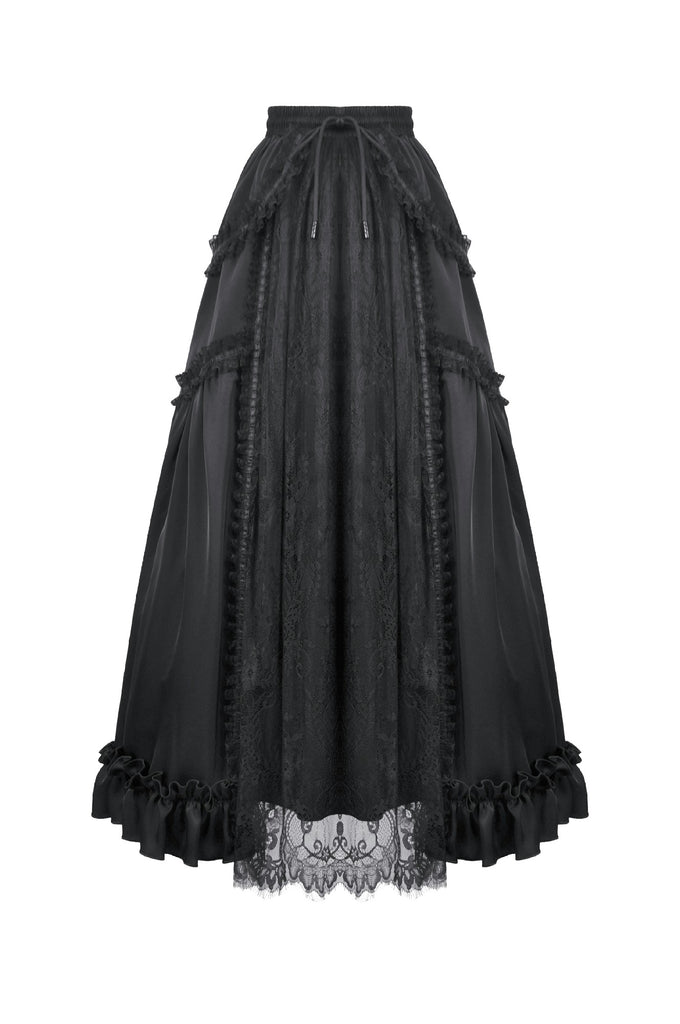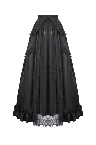 This long palace-style skirt merges the silky sheen of satin with intricately patterned black lace, creating a look that feels both aristocratic and enchantingly gothic. The satin catches the light like liquid metal, while the layered lace evokes the ornate vines and wrought-iron motifs of an old castle window.