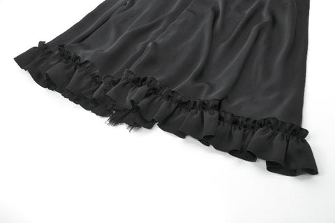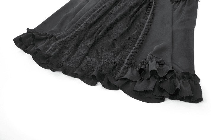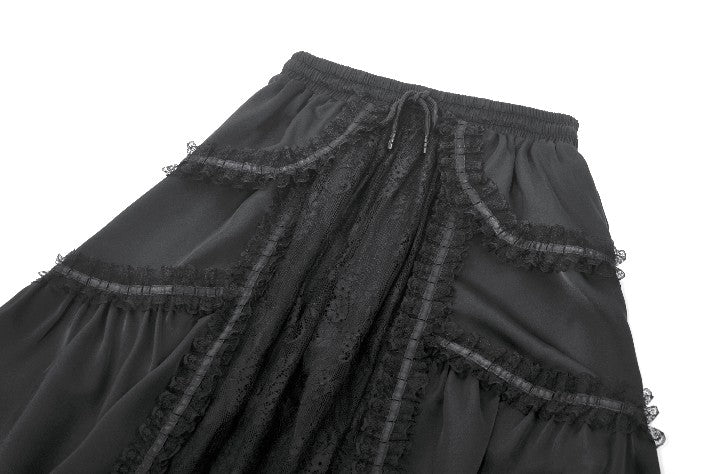 Delicate lace trims and ruffled edges cascade through the hemline, forming soft, floating layers that sway elegantly with movement—almost like the wings of a nocturnal ballgown. The adjustable drawstring waist ensures a comfortable and customizable fit, enhancing both practicality and refinement.