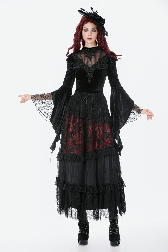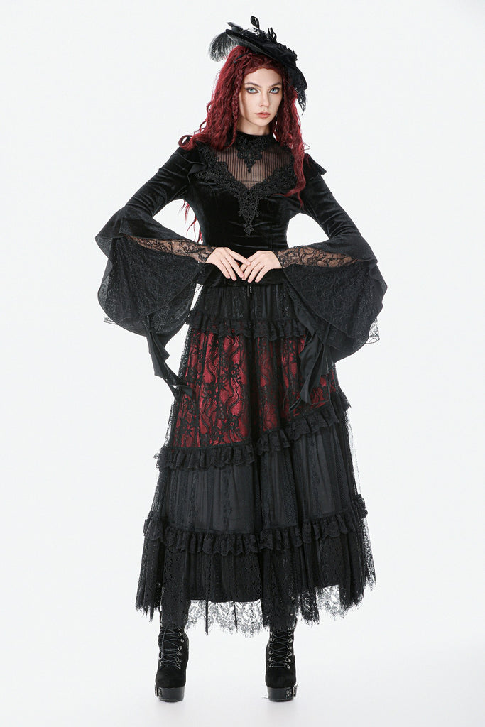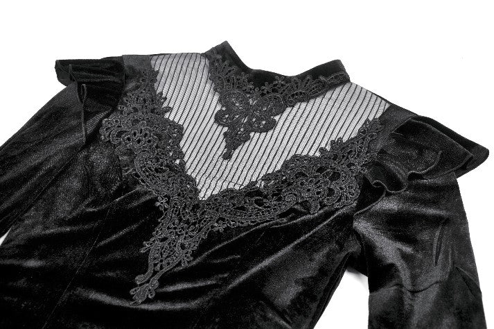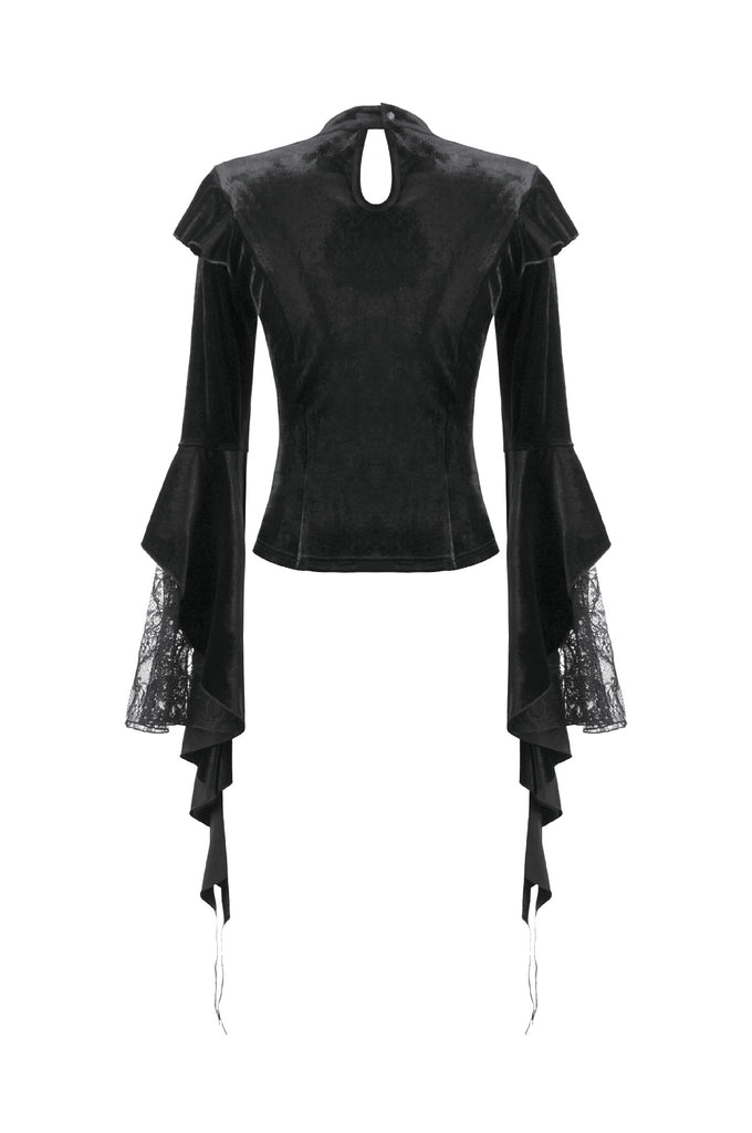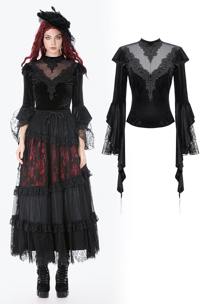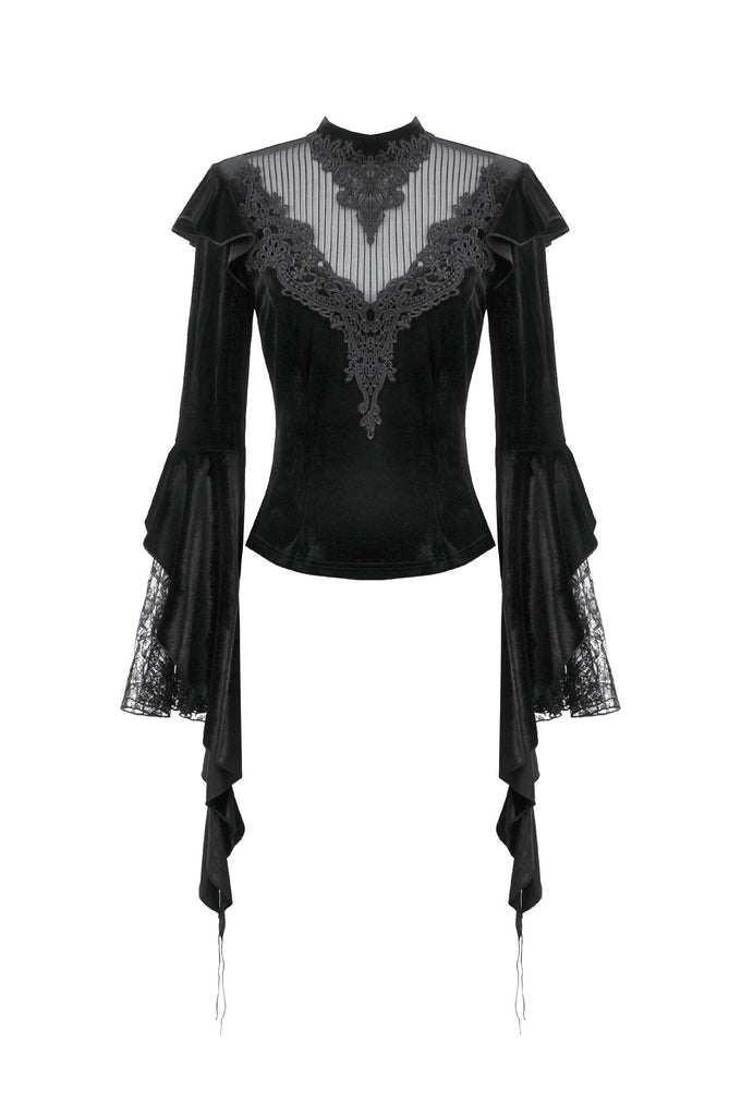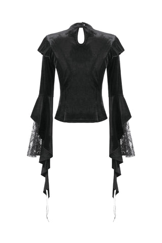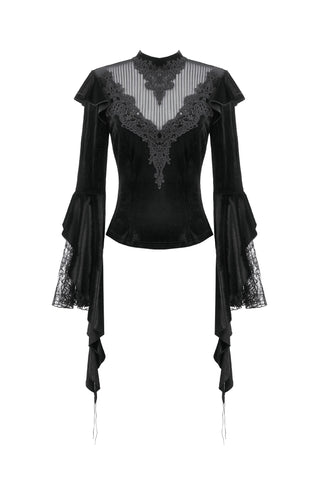 This top features a black velvet body paired with sheer mesh and vintage embroidery forming a V-shaped visual structure at the neckline and chest. Symmetrical lace detailing highlights the front design. The exaggerated bell sleeves incorporate refined lace and flowing velvet ribbons for layered movement. The high neckline fits closely to the neck, secured with a back button closure for easy wear. Fine craftsmanship ensures smooth lace-to-velvet transitions, blending vintage velvet texture with Gothic lace elements for an elegant and mysterious style.