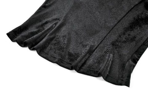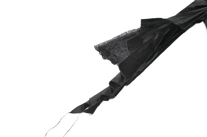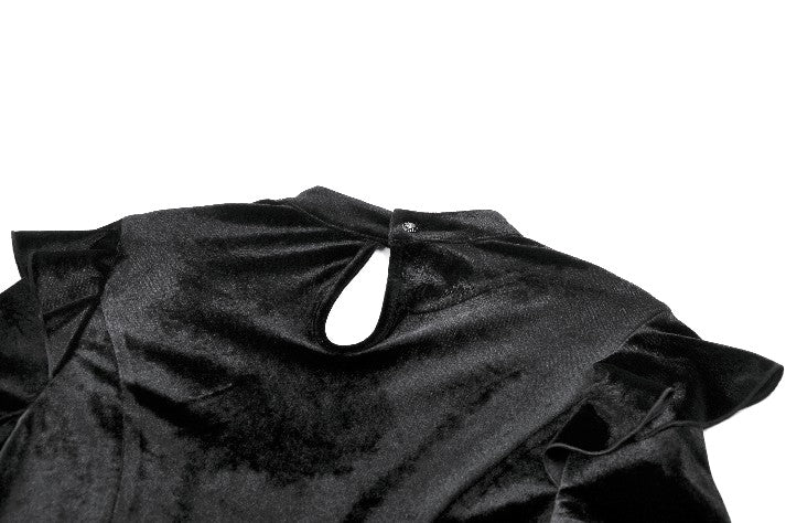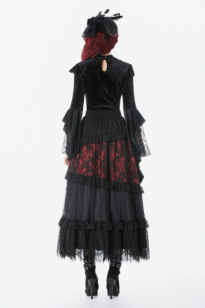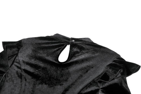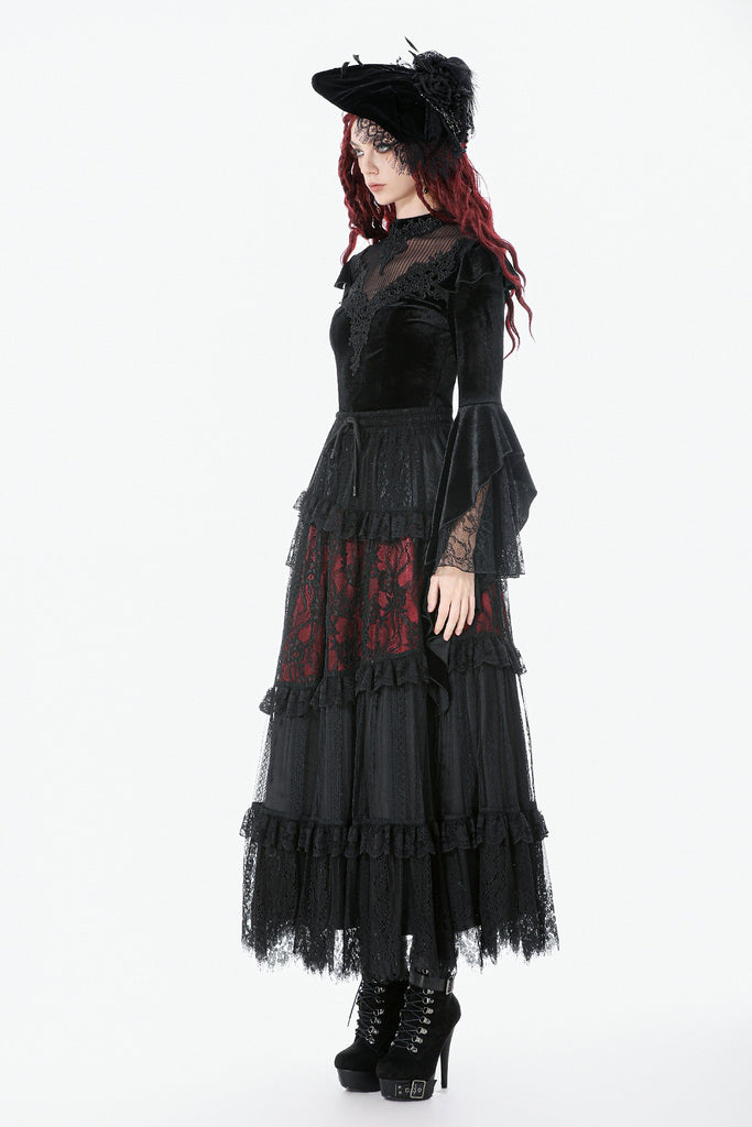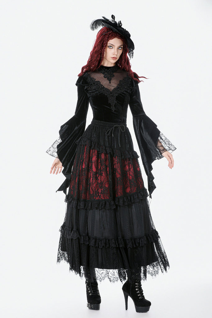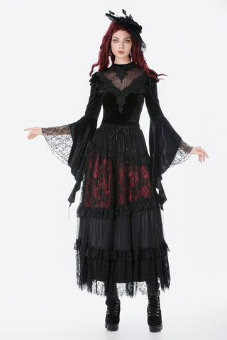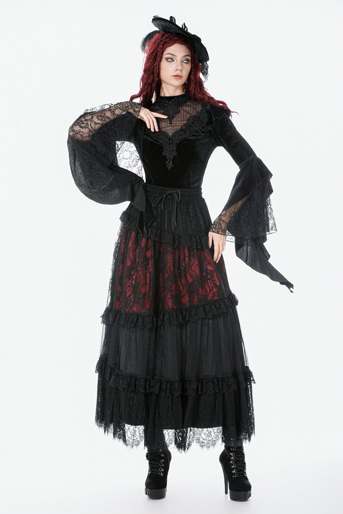 This top features a black velvet body paired with sheer mesh and vintage embroidery forming a V-shaped visual structure at the neckline and chest. Symmetrical lace detailing highlights the front design. The exaggerated bell sleeves incorporate refined lace and flowing velvet ribbons for layered movement. The high neckline fits closely to the neck, secured with a back button closure for easy wear. Fine craftsmanship ensures smooth lace-to-velvet transitions, blending vintage velvet texture with Gothic lace elements for an elegant and mysterious style.