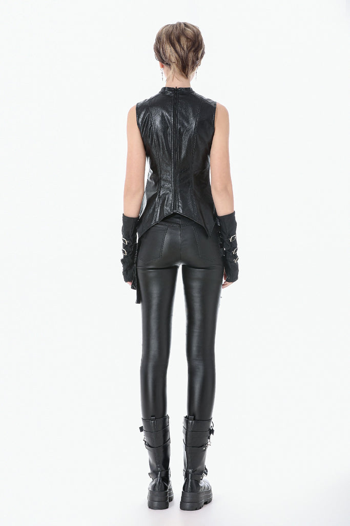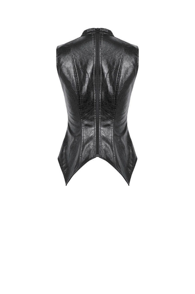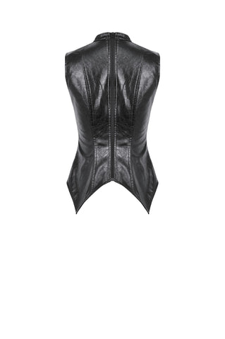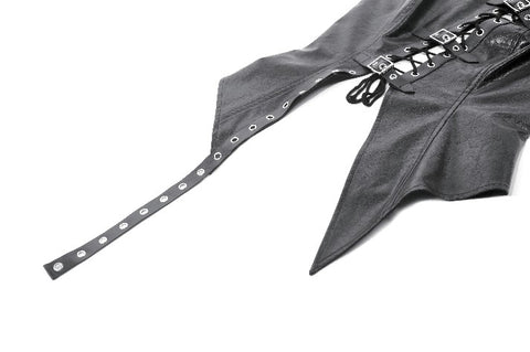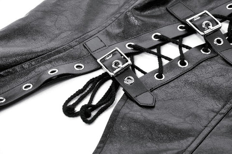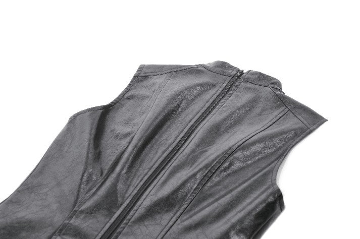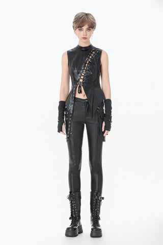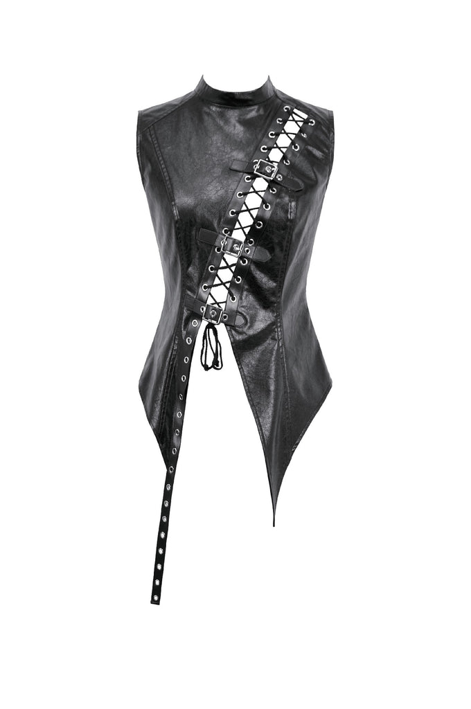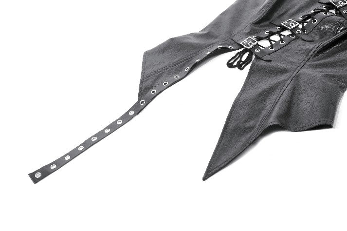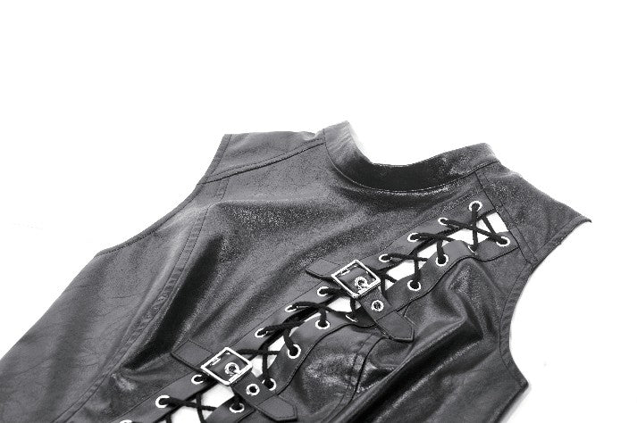 This punk leather top blends steampunk influences with mechanical retro details and deconstructed utility aesthetics. The distressed leather delivers a rugged vintage texture, while the diagonal lace-up design, metal grommets, and buckle accents add a bold industrial feel. The asymmetric hem enhances visual impact, and the fitted, sleeveless vest silhouette creates a sharp, sculpted shape. A highly detailed statement piece with strong stage presence.