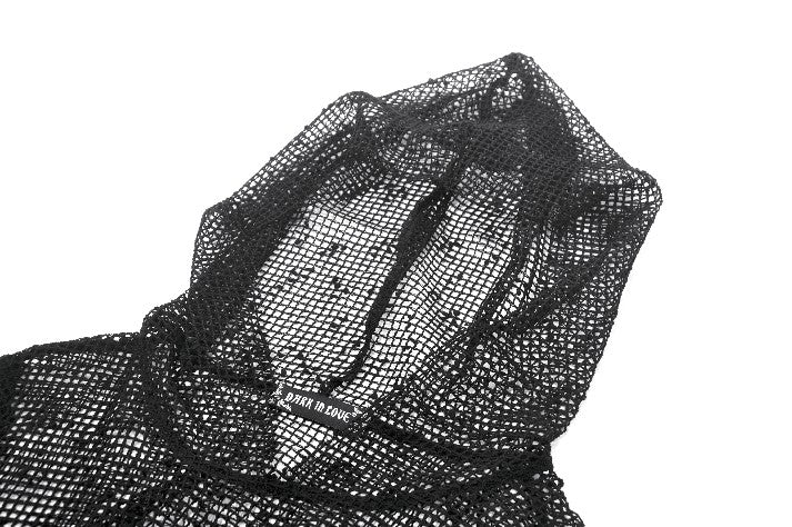 This mesh base top features a fully hollow-out grid fabric for a bold punk and futuristic look. The hood adds a mysterious edge, while the sleeves use a separated construction connected by metal grommet straps for a distinctive deconstructed effect. Lightweight and breathable, it works perfectly for layering or stage styling, delivering strong visual impact and subcultural aesthetics.