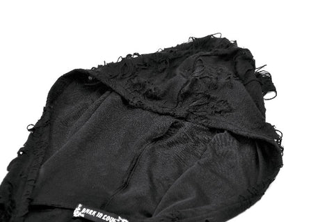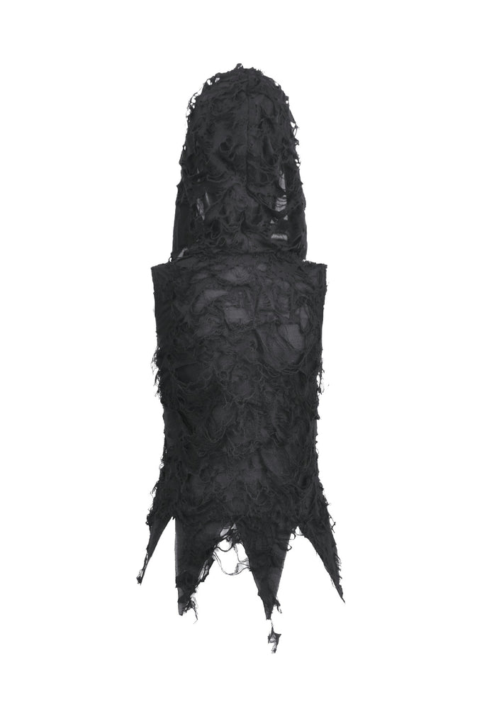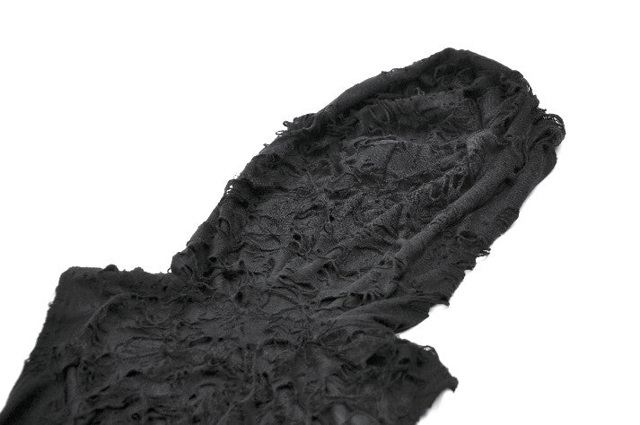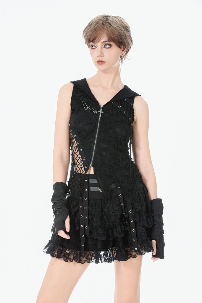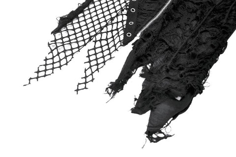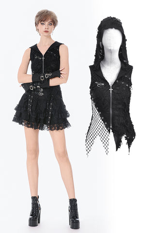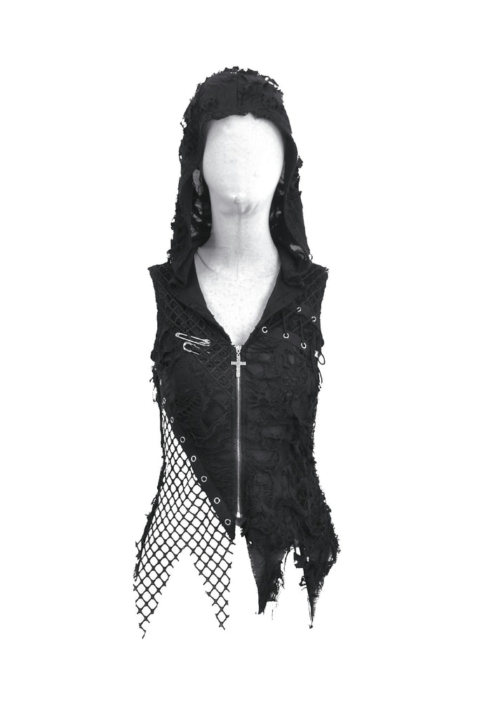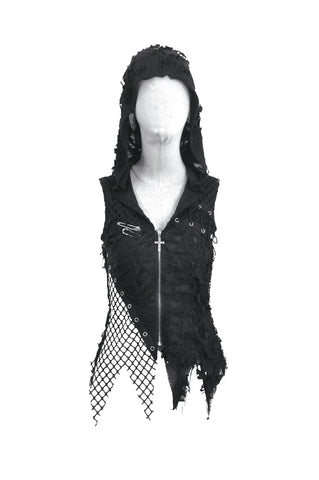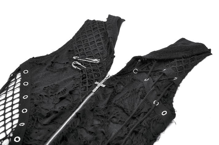 This rebel punk vest features a bold mix of distressed knit and plaid mesh panels for a striking deconstructed look. An open cutout at one side of the waist and an asymmetric hem create strong visual impact. The chest is detailed with metal pins and grommet lace-up accents, highlighting classic punk elements. Finished with a hood and stretch fabric, it offers a flexible fit without adjustment, balancing comfort with edgy style.