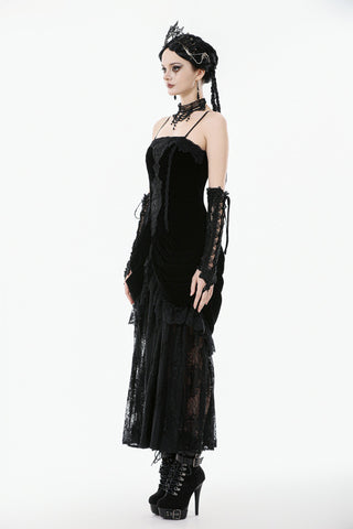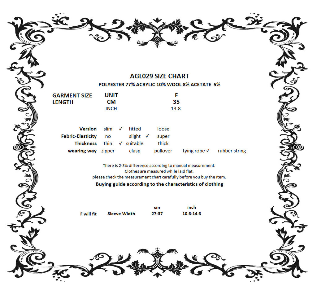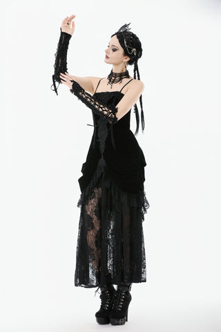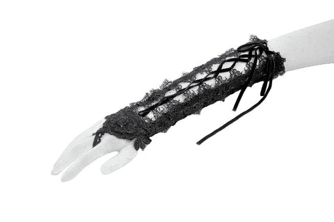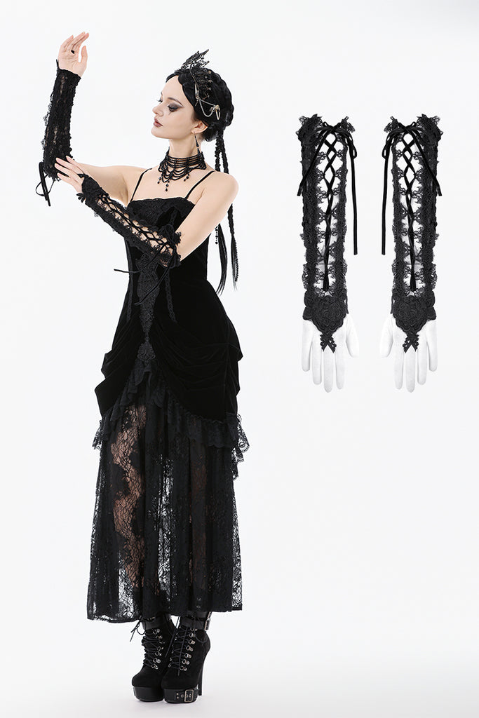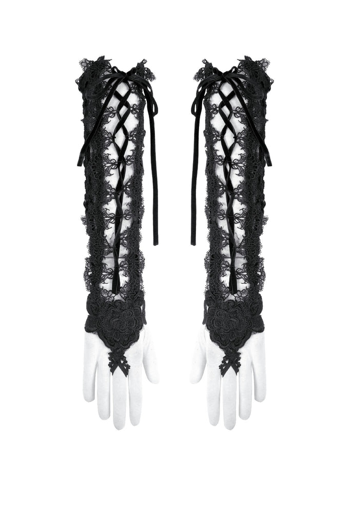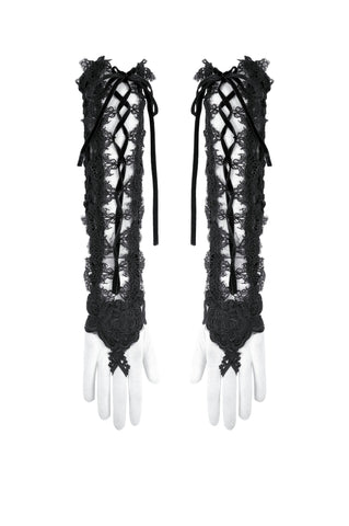 These Gothic-style long gloves feature intricate lace and floral trimmings, with a delicate rose motif on the back of the hand. The arms are adorned with crisscross ribbon ties and gathered detailing at the back, offering both adjustability and a dramatic look. Designed to elongate the arms with an elegant yet mysterious touch, they are perfect for pairing with Gothic dresses, evening wear, or stage costumes.