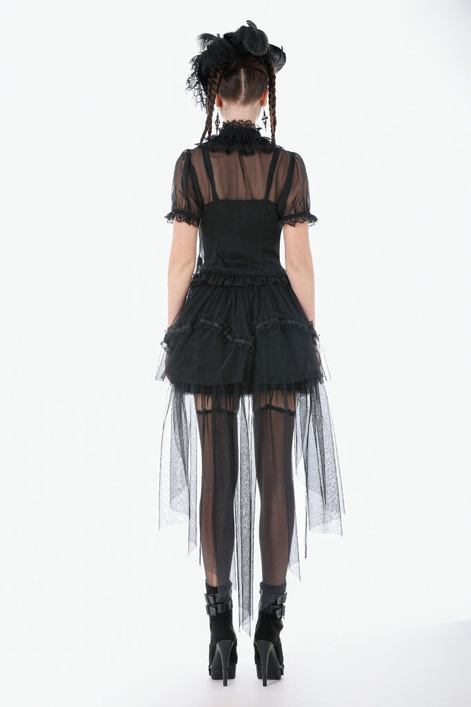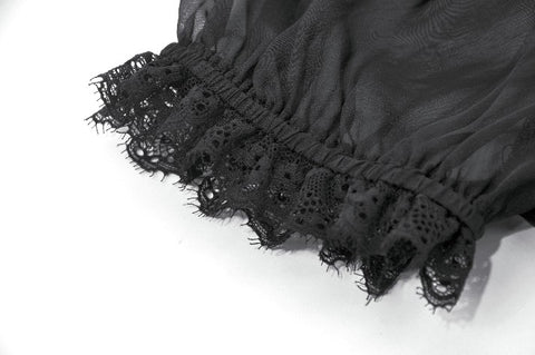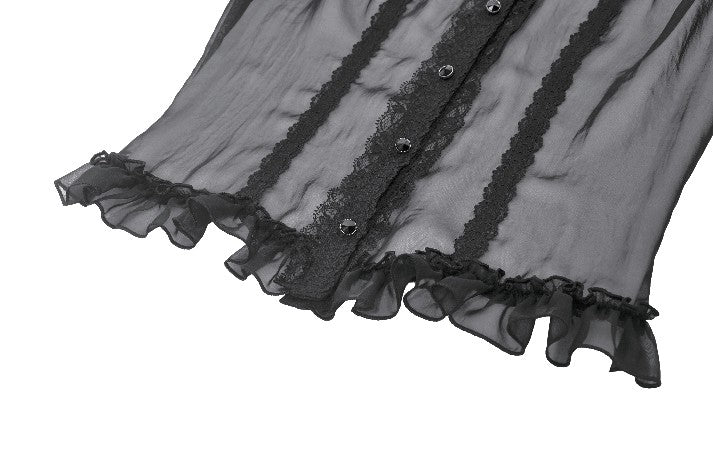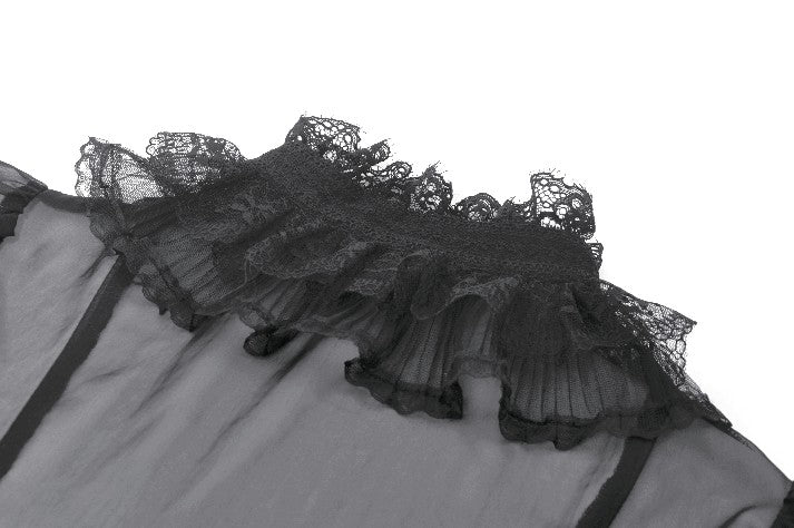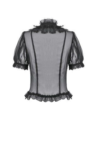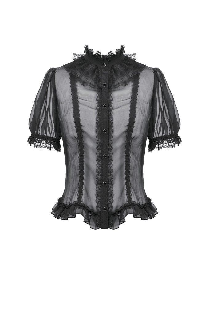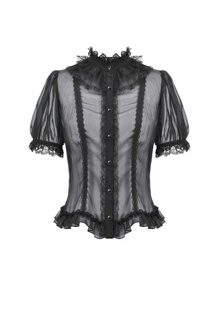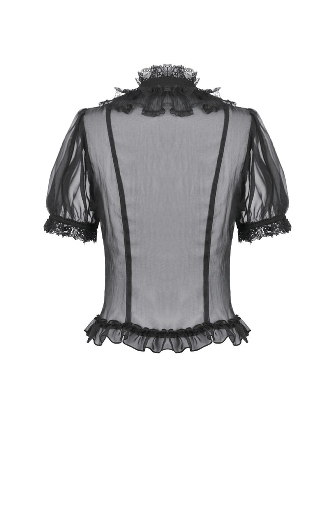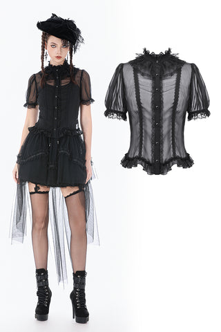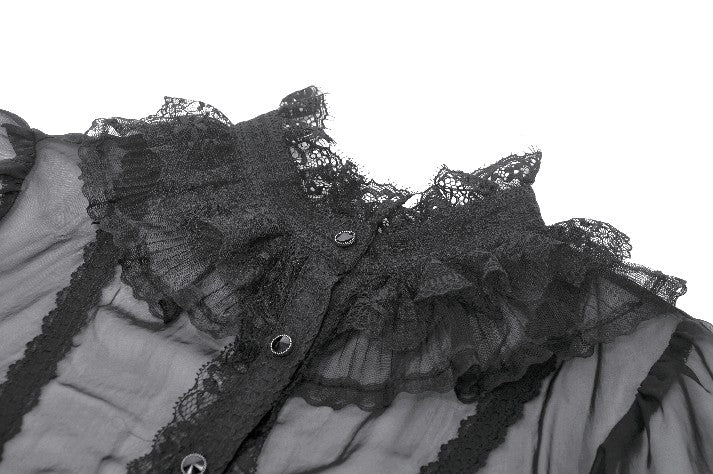 This courtly sheer blouse is crafted from lightweight translucent woven fabric, creating a subtle veil-like effect that enhances its pure Gothic allure. The design features a standing collar, with the neckline, placket, and cuffs all trimmed in intricate black lace. The delicate lace patterns and clean stitching form a refined contrast against the sheer fabric, offering rich visual layering.