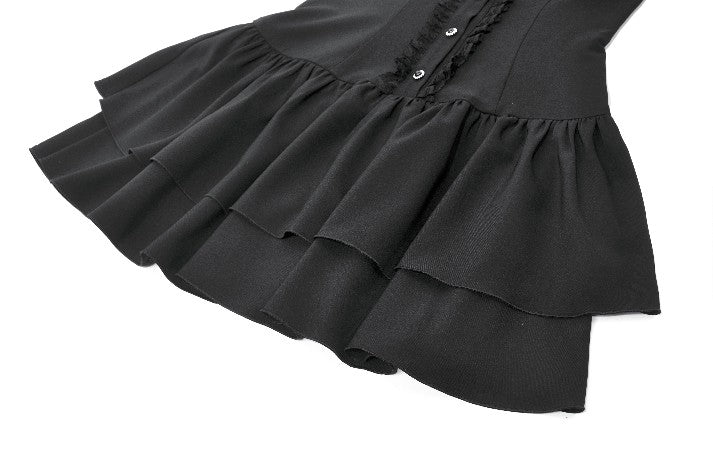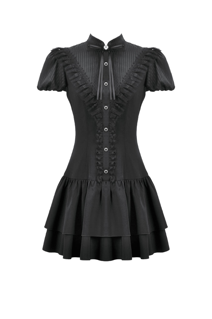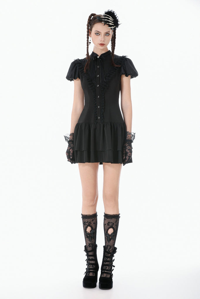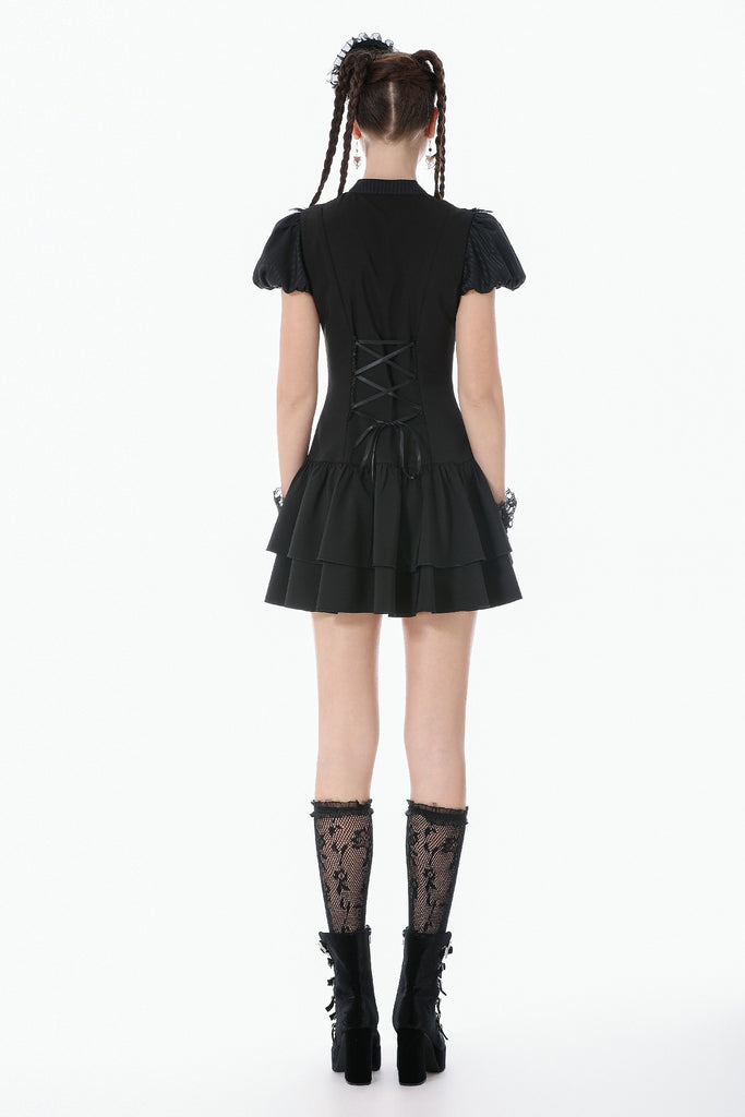 The puff short sleeves create a soft, cute silhouette, and the double-layered skirt builds volume and structure for a rich, tiered look. Blending elegance, cuteness, and dark gothic aesthetics, this dress is perfect for daily styling, gatherings, or photo shoots.