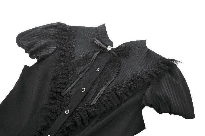 This dark Lolita dress is crafted from striped satin combined with slightly elastic woven fabric. The striped satin bodice offers a subtle sheen, while the V-shaped ruffled lace trim along the buttoned placket enhances its vintage and sweet-gothic charm. A delicate bow and a decorative jewel button accent the neckline, adding a touch of elegance and sweetness.