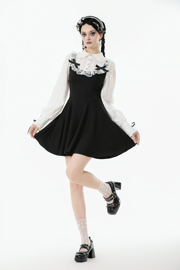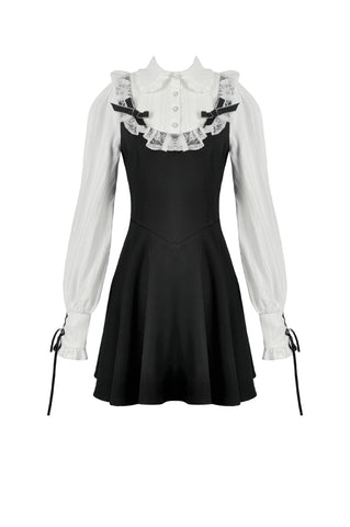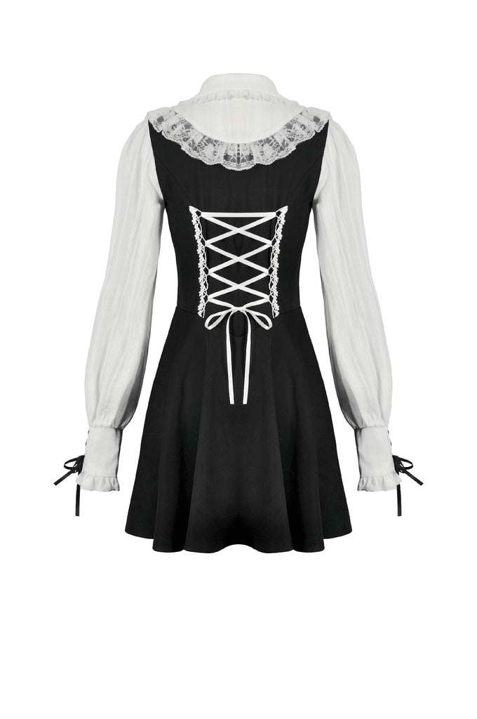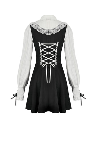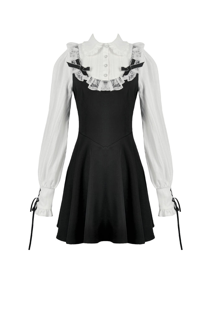 Delicately sweet with a refined edge, this Lolita dress features a charming faux two-piece design crafted from off-white textured fabric and contrasting black twill. The vintage-inspired Peter Pan collar is trimmed with lace and bow accents, while the real front placket adds both style and function. Lace-up ribbon cuffs on the sleeves and adjustable corset-style lacing on the back allow for a perfect fit and extra flair. Whether you're strolling with friends or adding elegance to your everyday look, this dress brings soft monochrome charm to any occasion.
