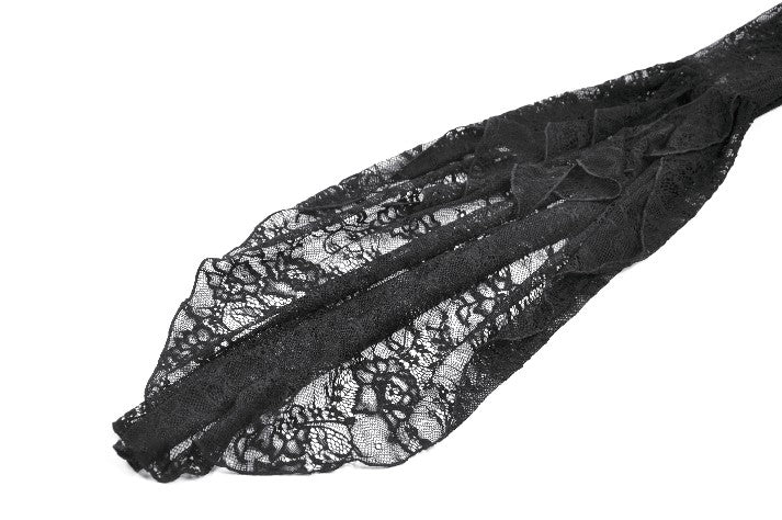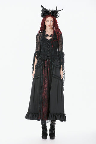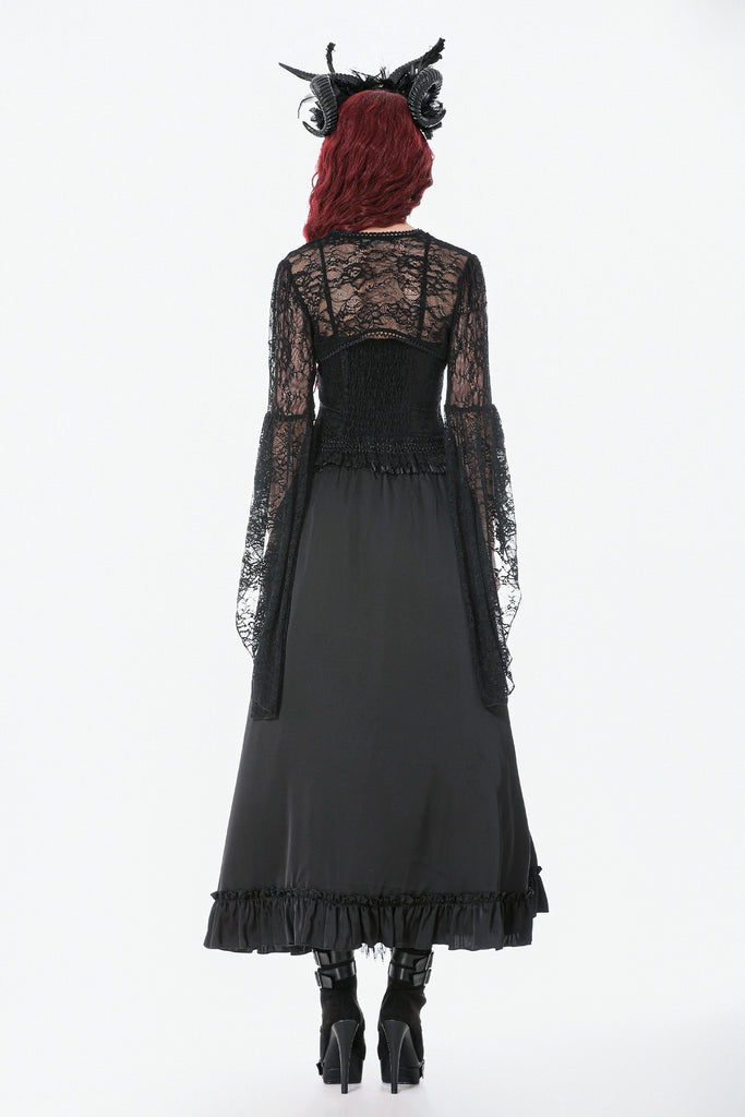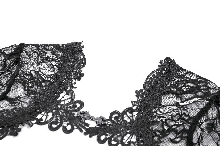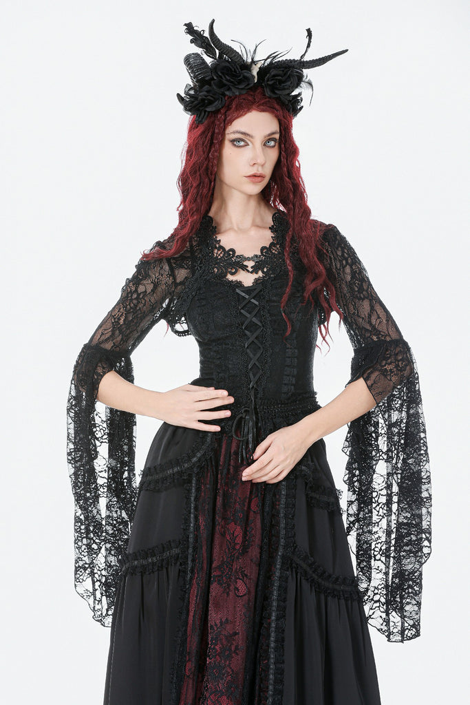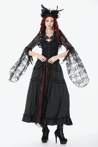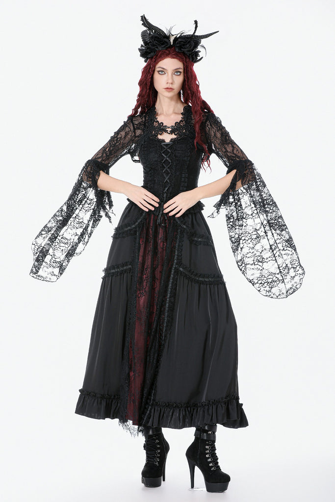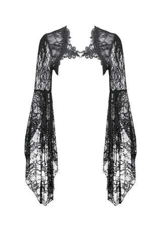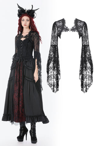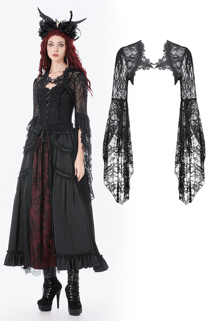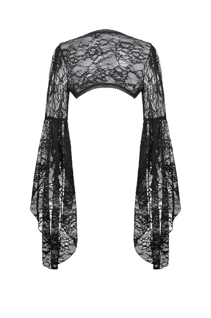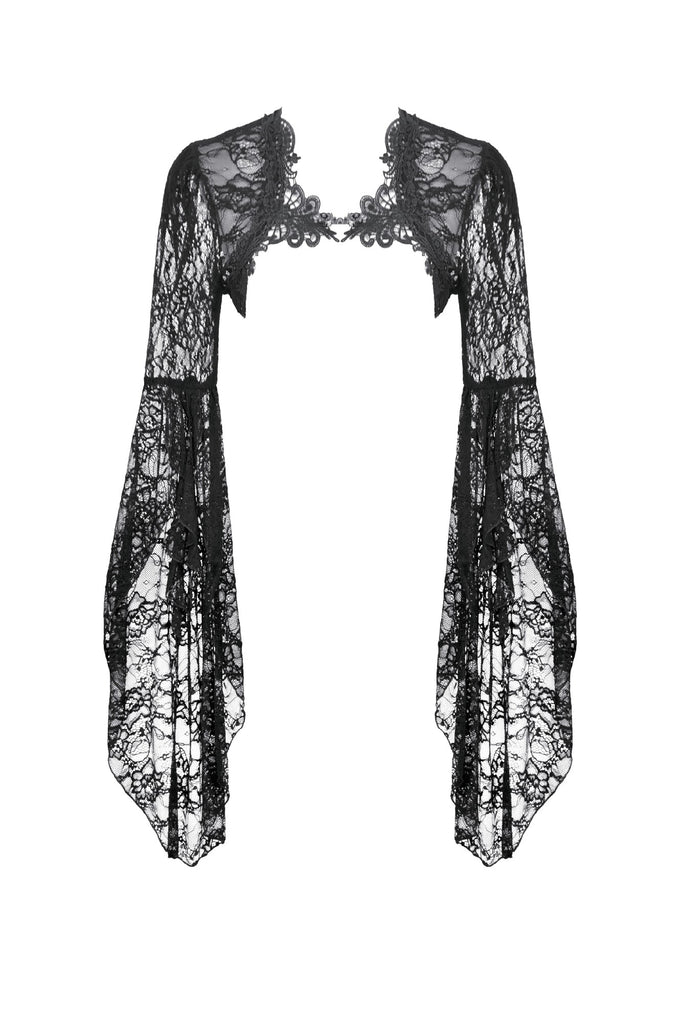 The black 3D lace reveals deep, shadow-like textures, as if grown from the night itself. The front connects with an intricate carved lace panel and gunmetal vintage clasps, giving the piece a refined dark elegance. The shawl features long bell sleeves with flared cuts, while two cascading lace trims add a soft yet mysterious touch. It blends cold beauty with subtle opulence in a distinctly Gothic style.