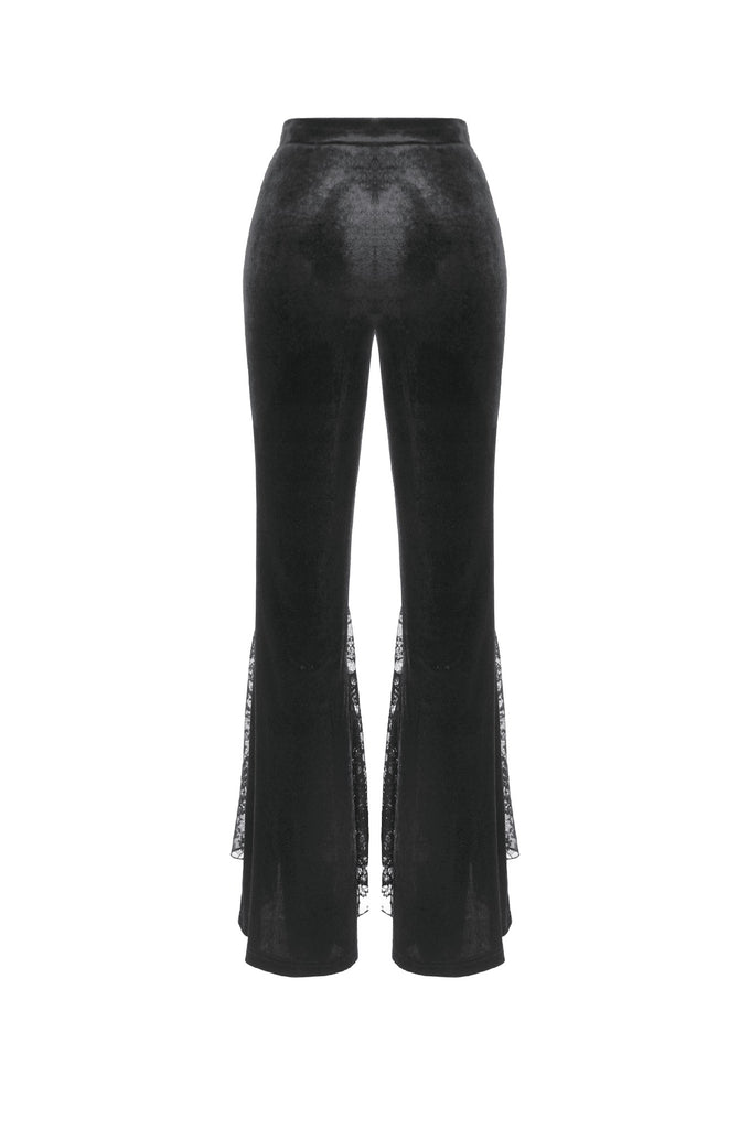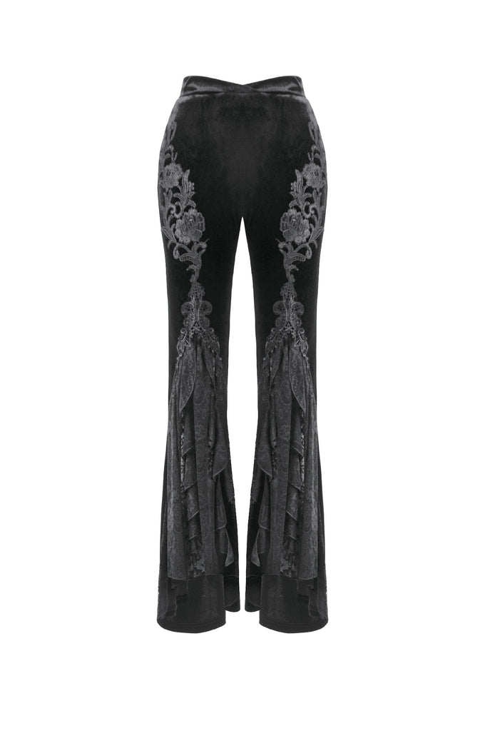 These Gothic-style flared pants are crafted from a luxurious blend of velvet and lace fabrics. The V-shaped waistband enhances a slender silhouette, while large appliqué designs extend from the thigh to the knee, standing out boldly against the deep velvet background. Below the knees, inverted V-shaped lace panels flow seamlessly, adorned with draping tassels that sway with movement for a dramatic effect. Perfect for both stylish everyday wear and special occasions, these pants embody an elegant yet mysterious Gothic allure.