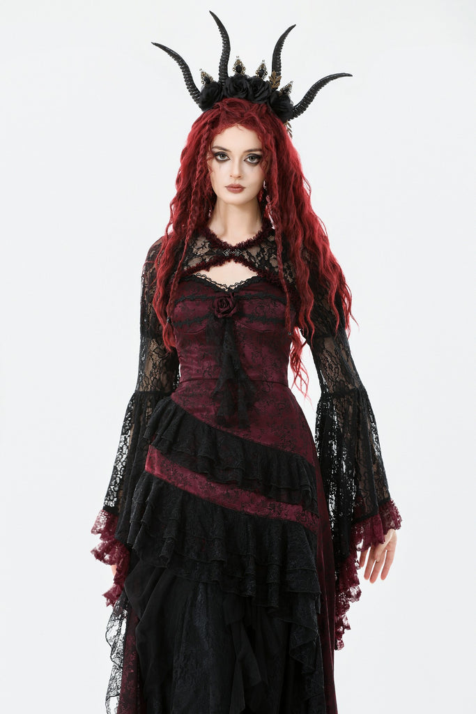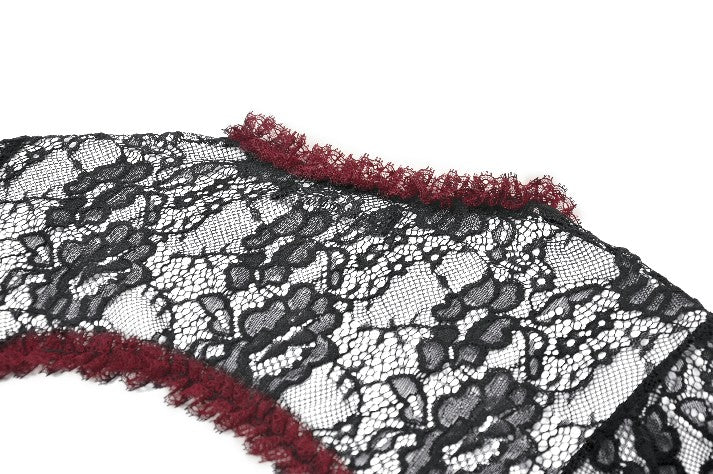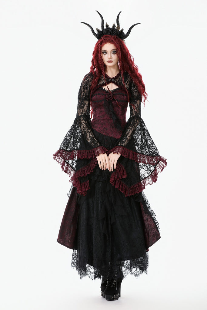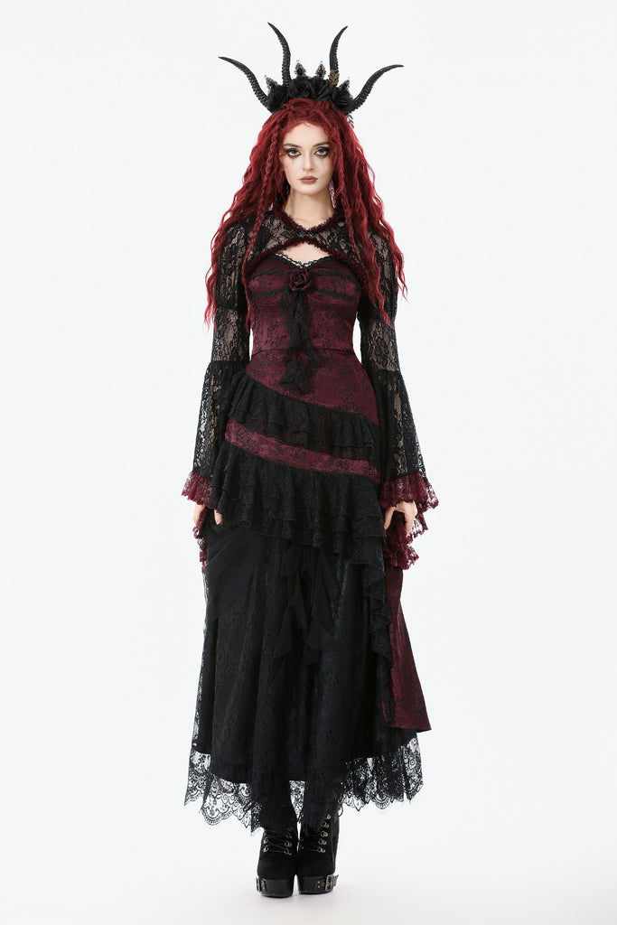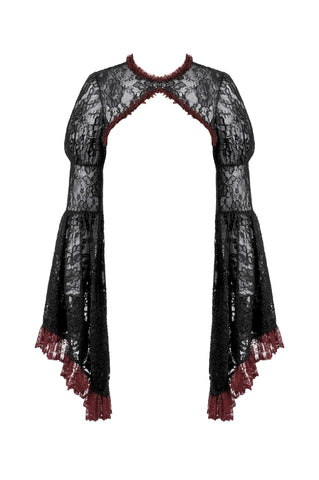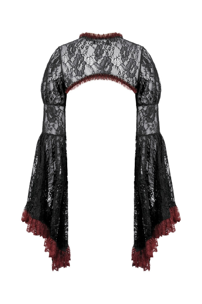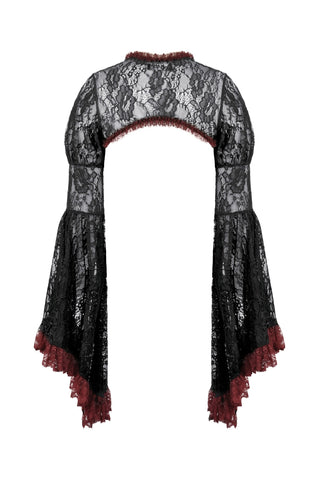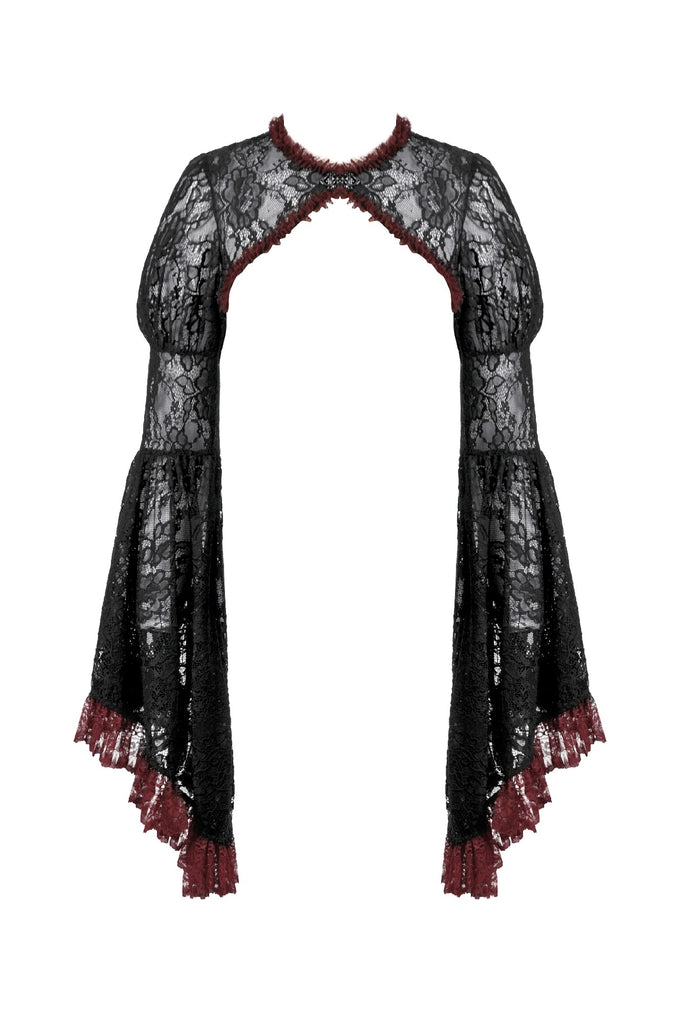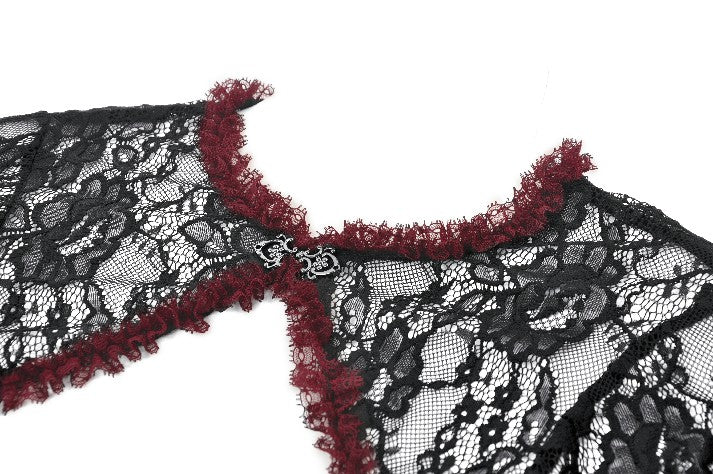 Black as night with crimson whispers. This fitted cardigan is crafted from stretchable vintage floral lace, offering comfort with a touch of drama. Red lace trims adorn the cuffs and neckline, while the antique gunmetal paisley clasps down the front echo the elegance of a forgotten aristocracy. Ideal for Gothic balls, conventions, or everyday darkwear—pair it with black-and-red coordinates or a full black ensemble for maximum effect.