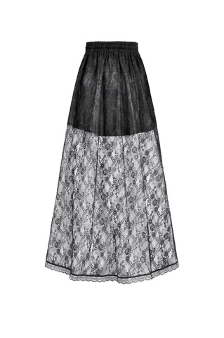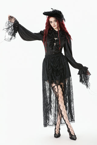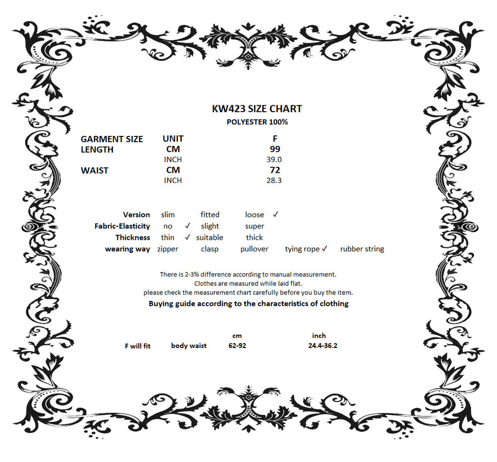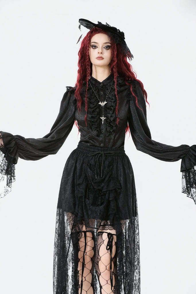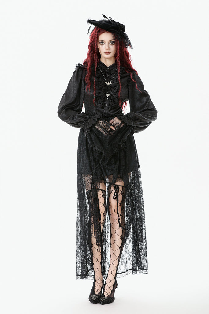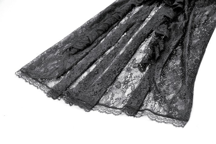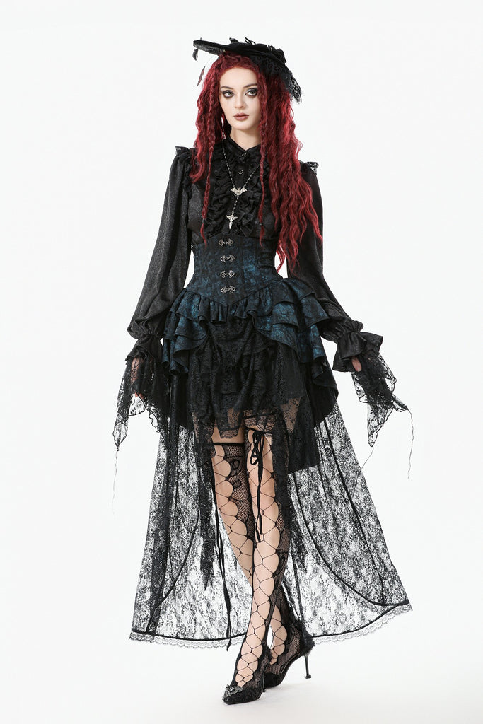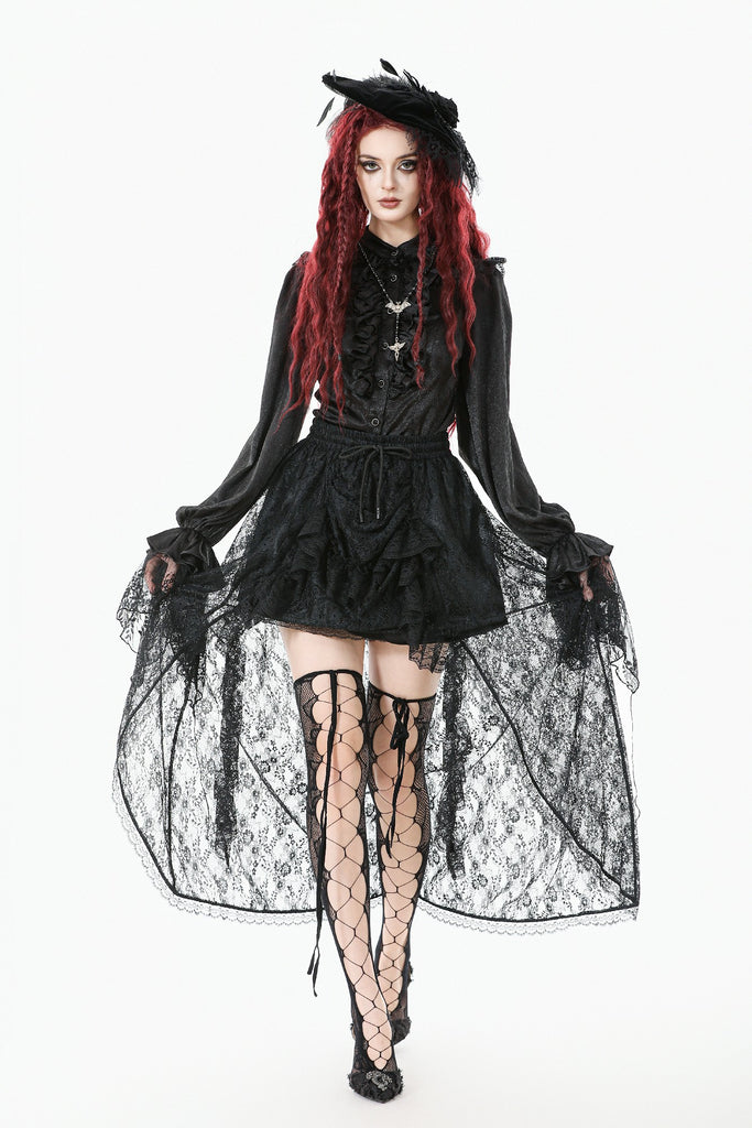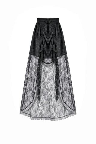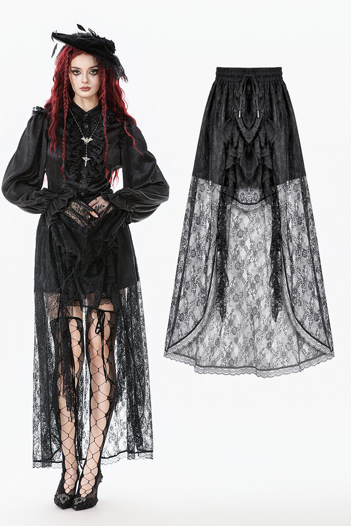 This Gothic court-style skirt is crafted from lace and lining fabric, featuring a dramatic high-low silhouette that adds both depth and elegance. The elastic waistband with an adjustable drawstring ensures a comfortable fit for various body types. The front is detailed with gathered pleats for a flattering shape, while both sides are adorned with draping lace trims for a graceful touch. The hem is finished with delicate lace edging for a refined look. Perfect for daily wear or formal occasions such as balls, especially when paired with a statement corset or ornate blouse.