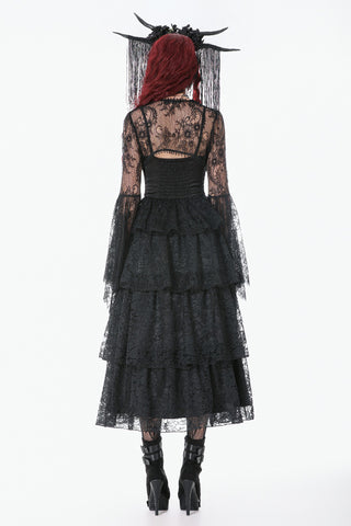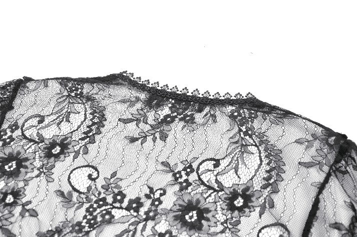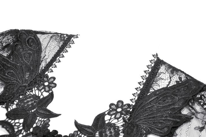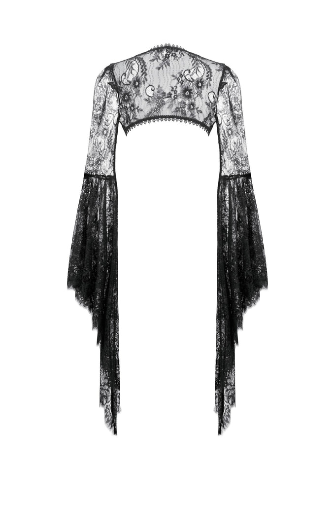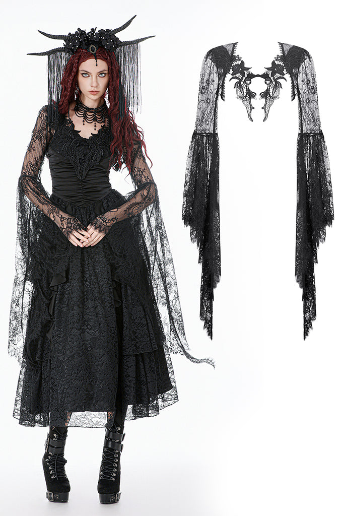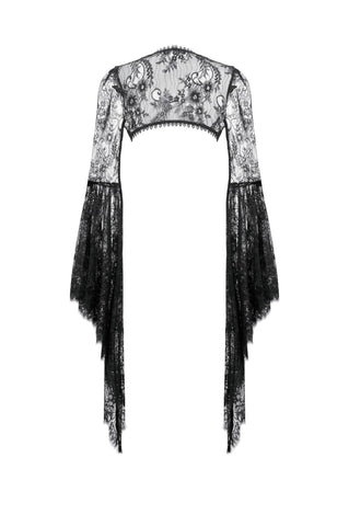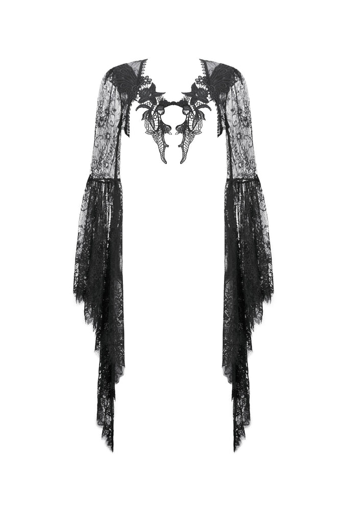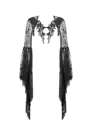 Crafted entirely from black lace, the shawl features rich layered textures and a symmetrical butterfly-and-flower motif at the chest, creating a refined and mysterious Gothic elegance. The deep-V neckline opens symmetrically and fits smoothly along the shoulders and arms. The long sleeves end in lace-matched bell shapes formed by angled cuts, adding fluidity to the silhouette. A vintage clasp at the center prevents slipping while enhancing the detailing. Lace trims around the neckline and hem complete the design with ornate, dramatic charm.