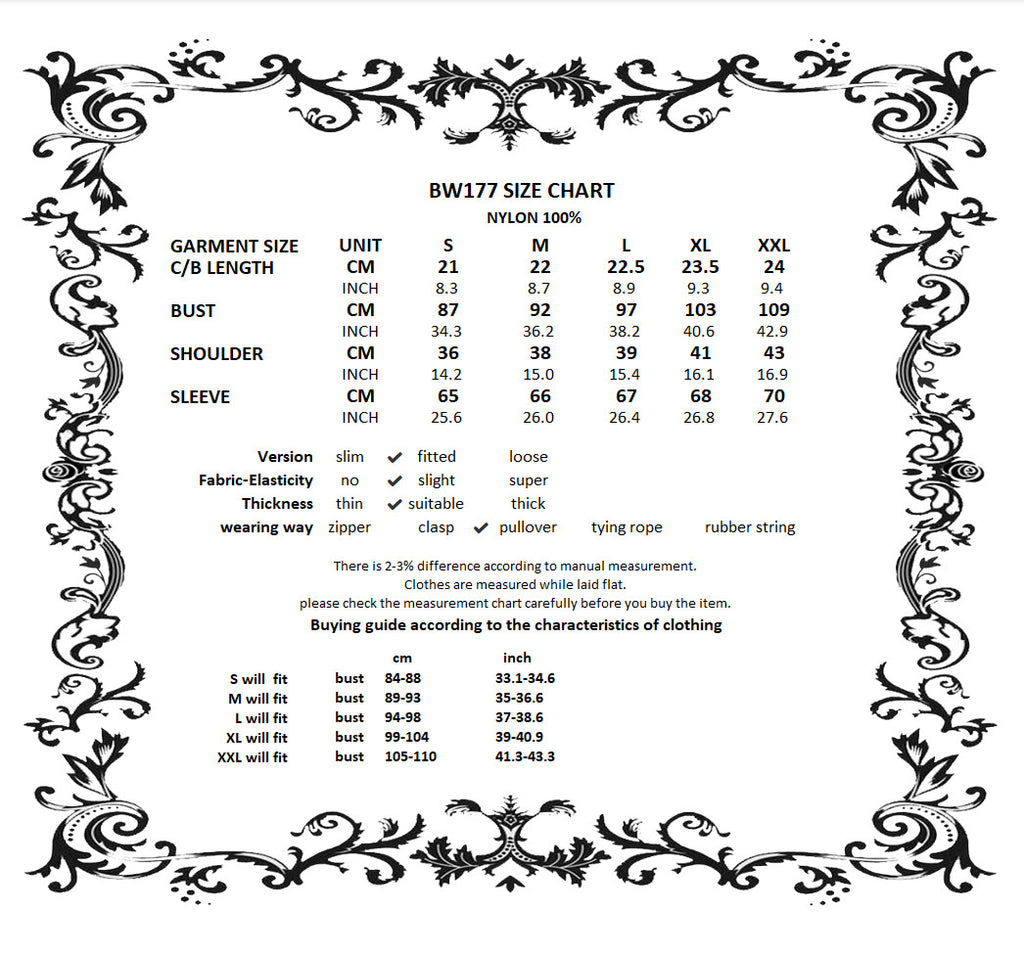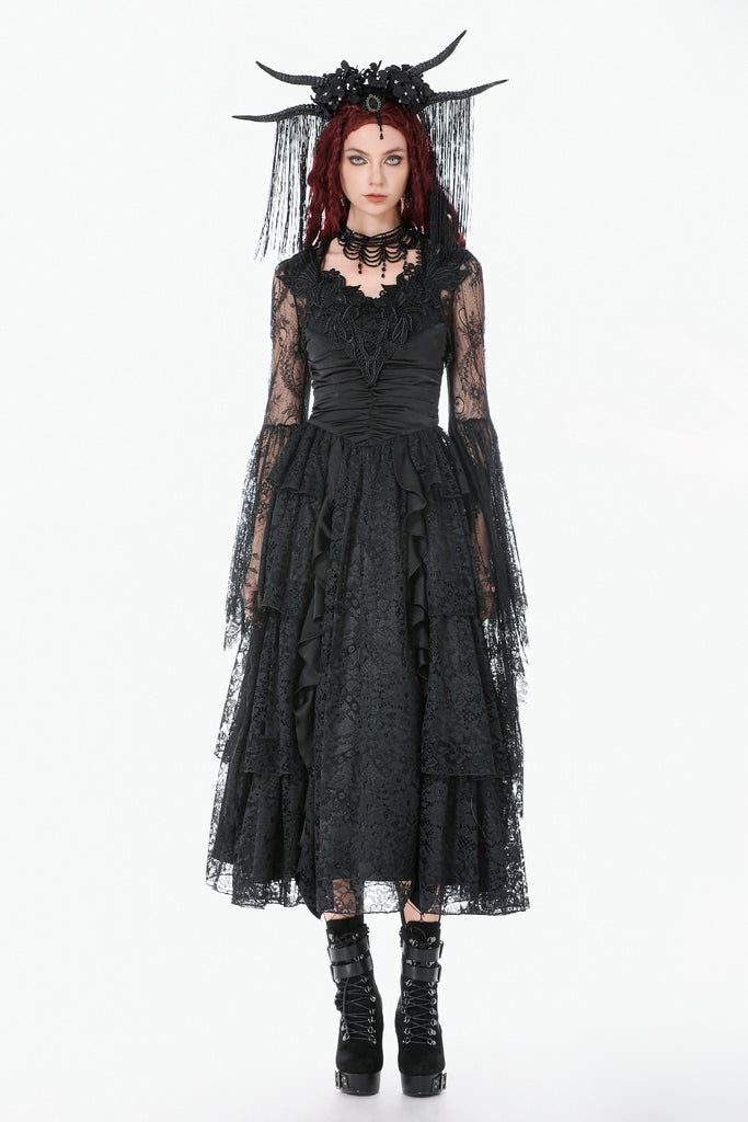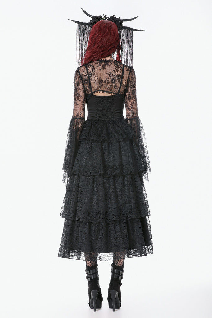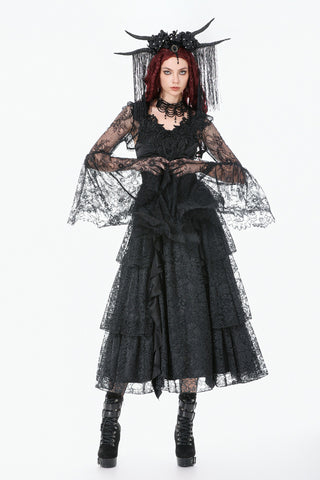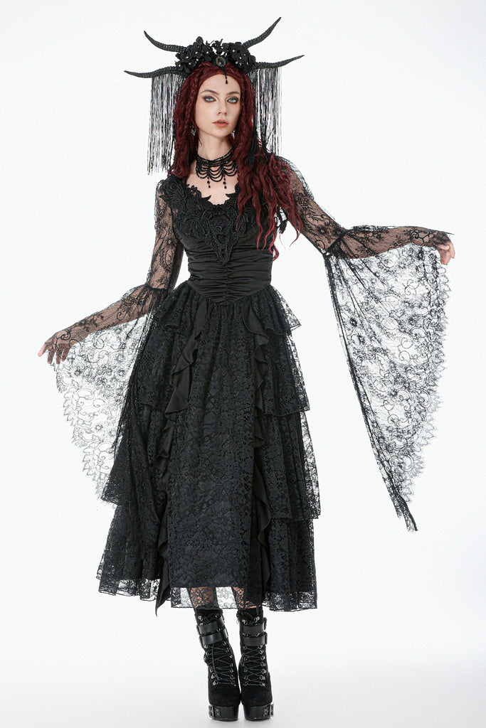 Crafted entirely from black lace, the shawl features rich layered textures and a symmetrical butterfly-and-flower motif at the chest, creating a refined and mysterious Gothic elegance. The deep-V neckline opens symmetrically and fits smoothly along the shoulders and arms. The long sleeves end in lace-matched bell shapes formed by angled cuts, adding fluidity to the silhouette. A vintage clasp at the center prevents slipping while enhancing the detailing. Lace trims around the neckline and hem complete the design with ornate, dramatic charm.