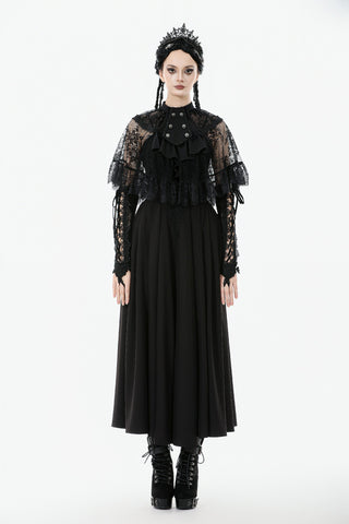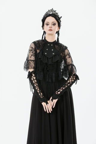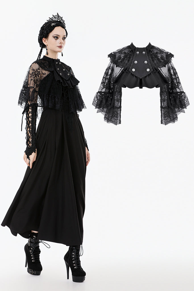 This cropped Gothic cape fuses structured woven fabric with delicate lace to create a hauntingly elegant silhouette. Ornate floral lace edges add visual richness, while the short length drapes just over the shoulders, perfect for layering or as a statement accessory. The double-button collar is both a fastening method and a decorative highlight, evoking the ceremonial flair of a nocturnal gathering in a forgotten manor.