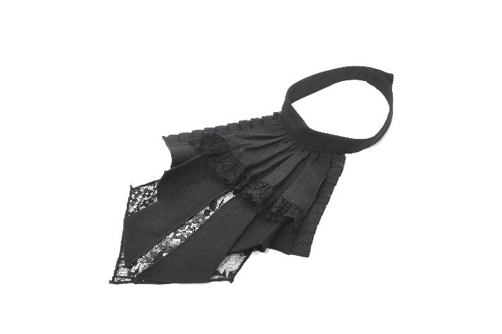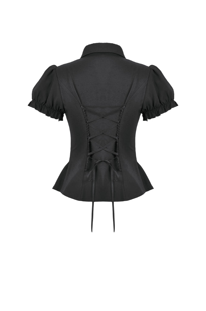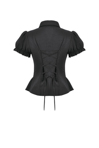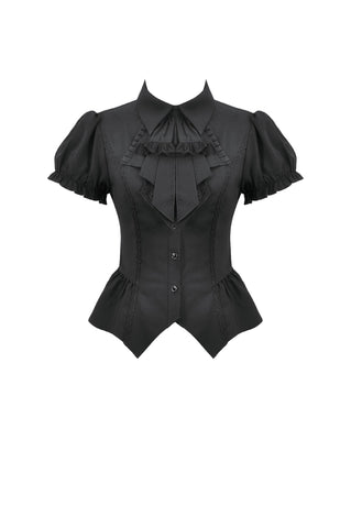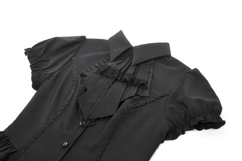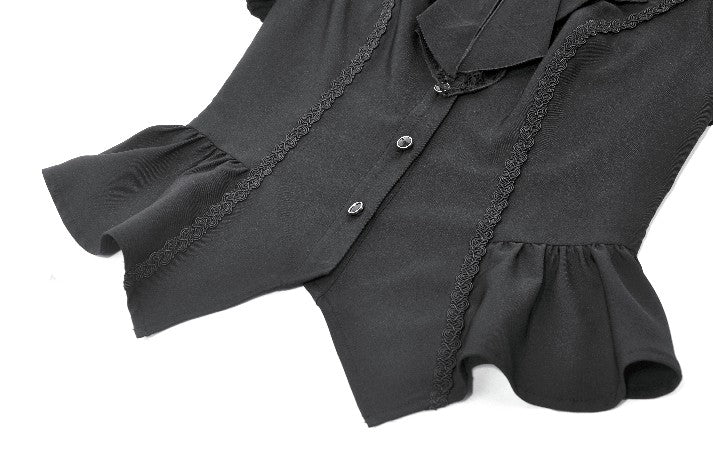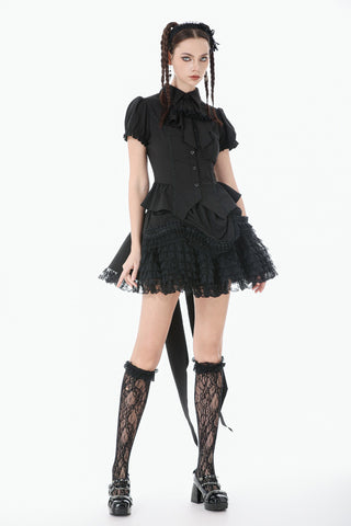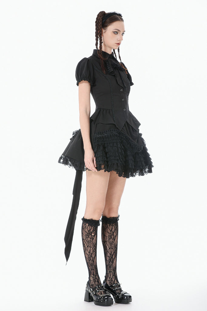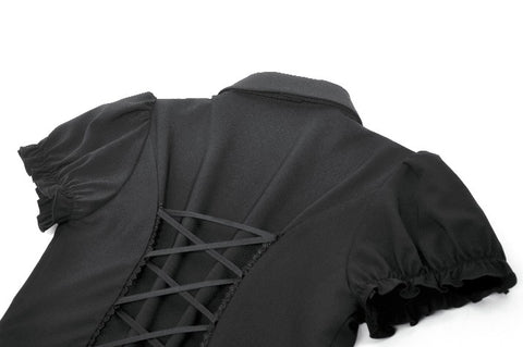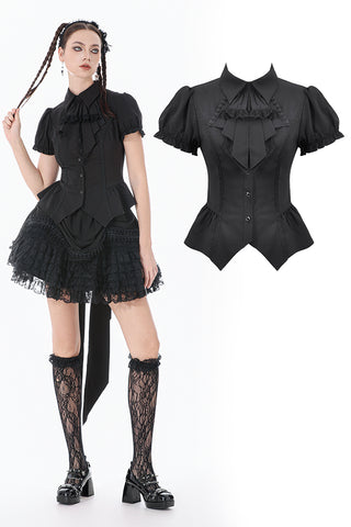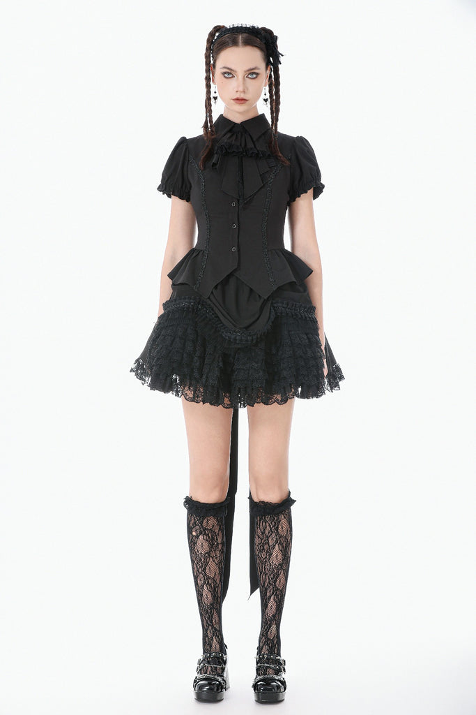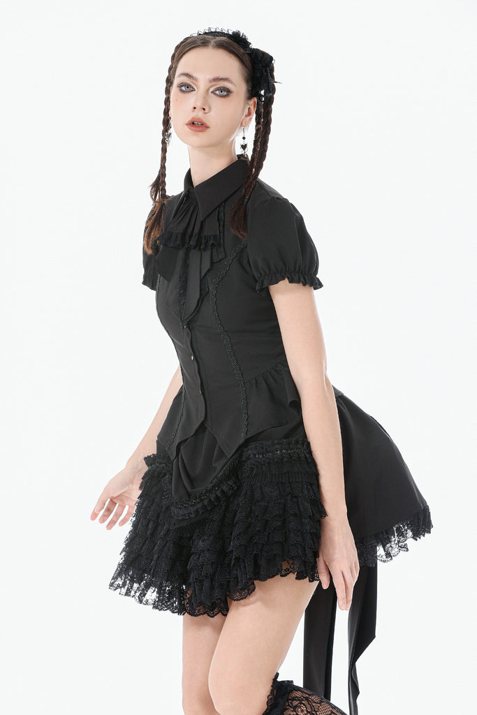This gothic short-sleeve black blouse features a detachable statement collar layered with delicate lace and pleated ruffles, delivering a refined yet sweet dark aesthetic. The puff sleeves add a playful softness and enhance the visual dimension.