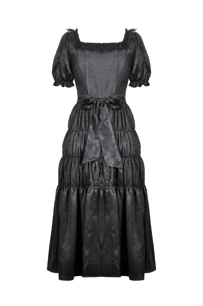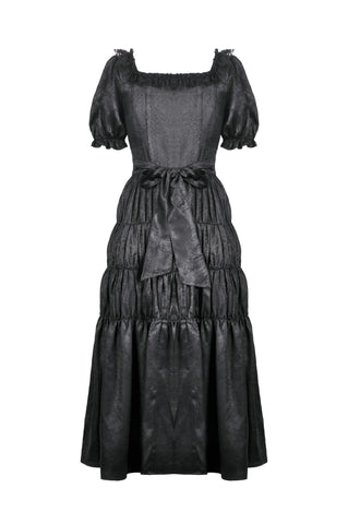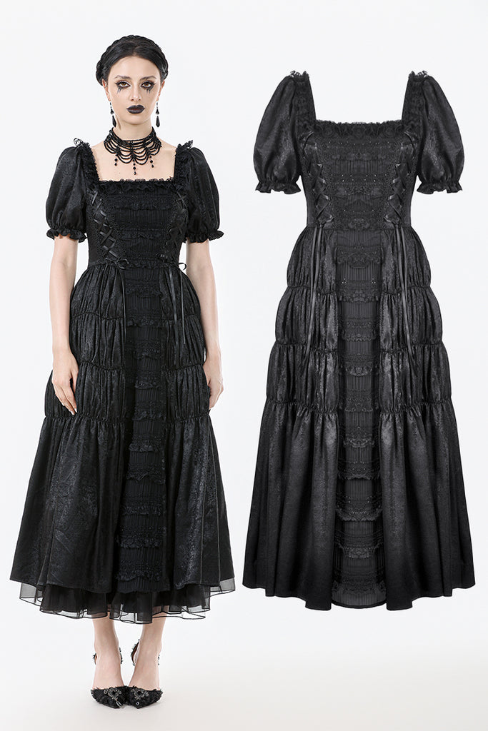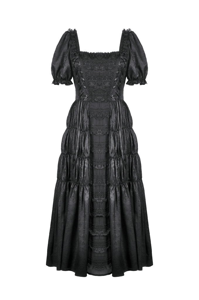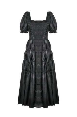Step into a lace-lined dream, where every ruffle is a whisper of vintage charm. The front center features layered frills delicately ruched over lace, cascading like secret petals in bloom. Elastic gathers on both sides sculpt the silhouette with a soft volume, reminiscent of a storybook maiden.