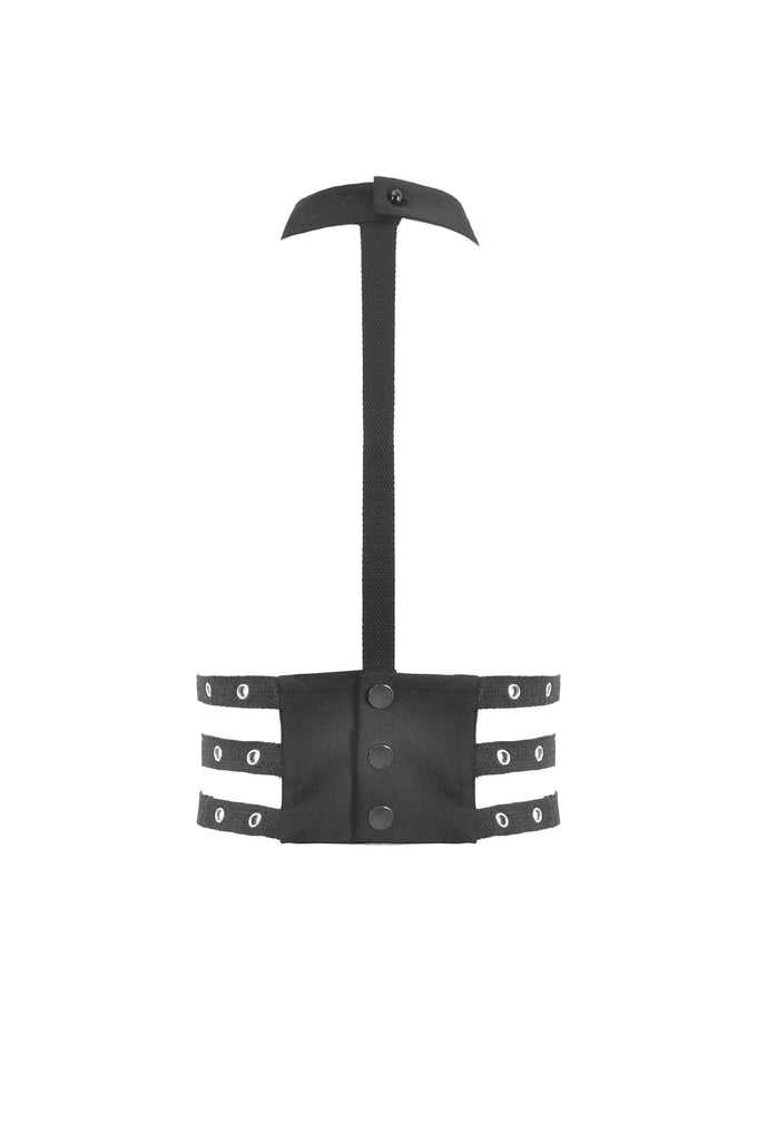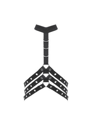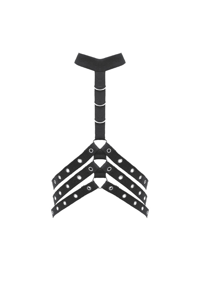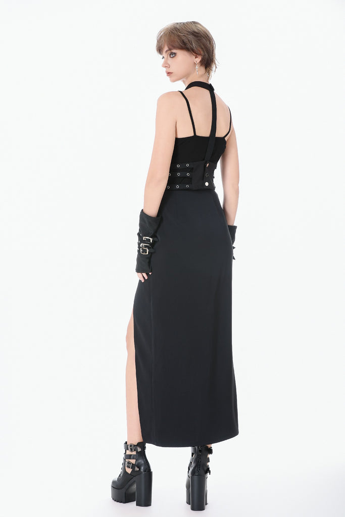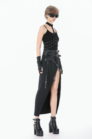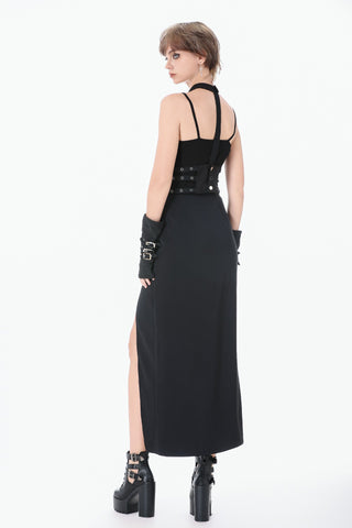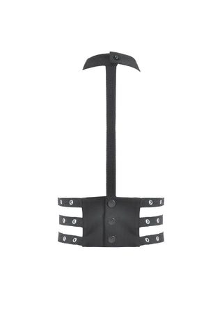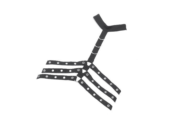 Designed with a strong punk influence, this waist cincher features three rib-inspired grommet straps that create a structured, mechanical look. A central webbing strap with a D-ring adds a striking focal detail. The back fastens with metal snap buttons for secure and easy wear. Bold and distinctive, it enhances silhouettes for dark fashion, punk, and subcultural styling.